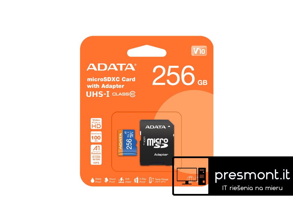 Paměťové karty MicroSDXC/SDHC UHS-I třídy 10 poskytují rychlost čtení až 100 MB za sekundu pro rychlý přenos souborů. Paměťové karty Premier microSDXC/SDHC UHS-I s výkonnostní třídou 10 umožňují nepřerušovaný a vysoce kvalitní záznam videa ve Full HD na chytrých telefonech a tabletech. Splňuje také standard A1 pro rychlejší a plynulejší spouštění aplikací. Vzhledem k tomu, že splňují normu V10 (Video Speed Class), mohou zaznamenávat až 10 MB videa za sekundu. Paměťové karty Premier microSDXC/SDHC UHS-I, které jsou k dispozici v kapacitách od 16 GB do 512 GB a jsou podpořeny spolehlivou vícebodovou ochranou, umožňují nadšencům do mobilních zařízení snadno nahrávat a sdílet nádherné vzpomínky! Rychlost čtení: až 100 MB/s Rychlost zápisu: až 25 MB/s Třída rychlosti: Class 10 UHS-I V10 A1 Robustní odolnost: vodotěsnost, nárazuvzdornost, antistatičnost, odolnost proti rentgenovému záření a široká teplotní podpora (- 25 °C až 85 °C). Záruka: 120 měsíců (V ATC, u Adaty doživotní)Dodatočné parametre
