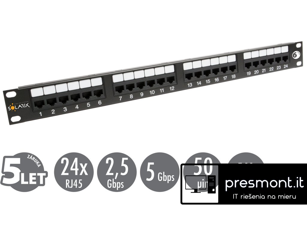 Patch panel Solarix s označením SX24-6-UTP-BK je vysoce kvalitní panel kategorie 6, který splňuje požadavky na komponenty této kategorie definované ve standardech ANSI/TIA 568, ISO/IEC 11801 a EN 50173 pro kategorii 6 a třídu vedení Class E, včetně všech nejnovějších dodatků. Tento panel je testován pro šířku pásma až do 350 MHz, čímž převyšuje požadavky specifikované pro kategorii 6. Panel je dodáván ve verzi s 24 porty RJ45 a je osazen moduly s duální IDC svorkovnicí 110/Krone. Kontakty jsou na svorkovnici z důvodu snadného zakončení datového kabelu označeny jednotlivými barvami podle typu zapojení a to buď podle standardu T568A nebo T568B. Panel SX24-6-UTP-BK patří do skupiny komponentů systému Solarix - kategorie 6 a stejně jako všechny komponenty v této produktové řadě je vyroben tak, aby poskytoval maximální životnost, vynikající výkon, spolehlivost a především jednoduchou instalaci. Barva Solarix patch panelu kategorie 6 je černá, velikost v datovém rozvaděči je 1U. Technické parametry Kategorie: CAT6 Podporované protokoly: 2.5/5GBASE-T a nižší Počet portů: 24 Stínění: ne Vyvazovací lišta: ne Min. životnost portu: 1 000 zapojení/odpojení Krytí kontaktů: 50 µ zlata a 100 µ niklu Svorkovnice: duální 110/Krone 8p8c Min. životnost svorkovnice: 200 zařezání Velikost a typ vodiče: AWG 26 - 22, drát Materiál nekovových částí: FR plast podle UL94-0 Barva: černá Velikost: 1U Výška: 44 mm Šířka: 484 mm Skladovací teplota: -40 až 70 °C Provozní teplota: -10 až 60 °C Max. provozní vlhkost: 93 % Balení: 1 ks, kartónový obal Rozměry balení (výška x šířka x hloubka): 76 mm x 505 mm x 58 mm Přepravní balení: 15 ks, kartónový box Rozměry přepravního balení (výška x šířka x hloubka): 235 mm x 515 mm x 400 mm Montážní sada v balení: 4x M6Dodatočné parametre