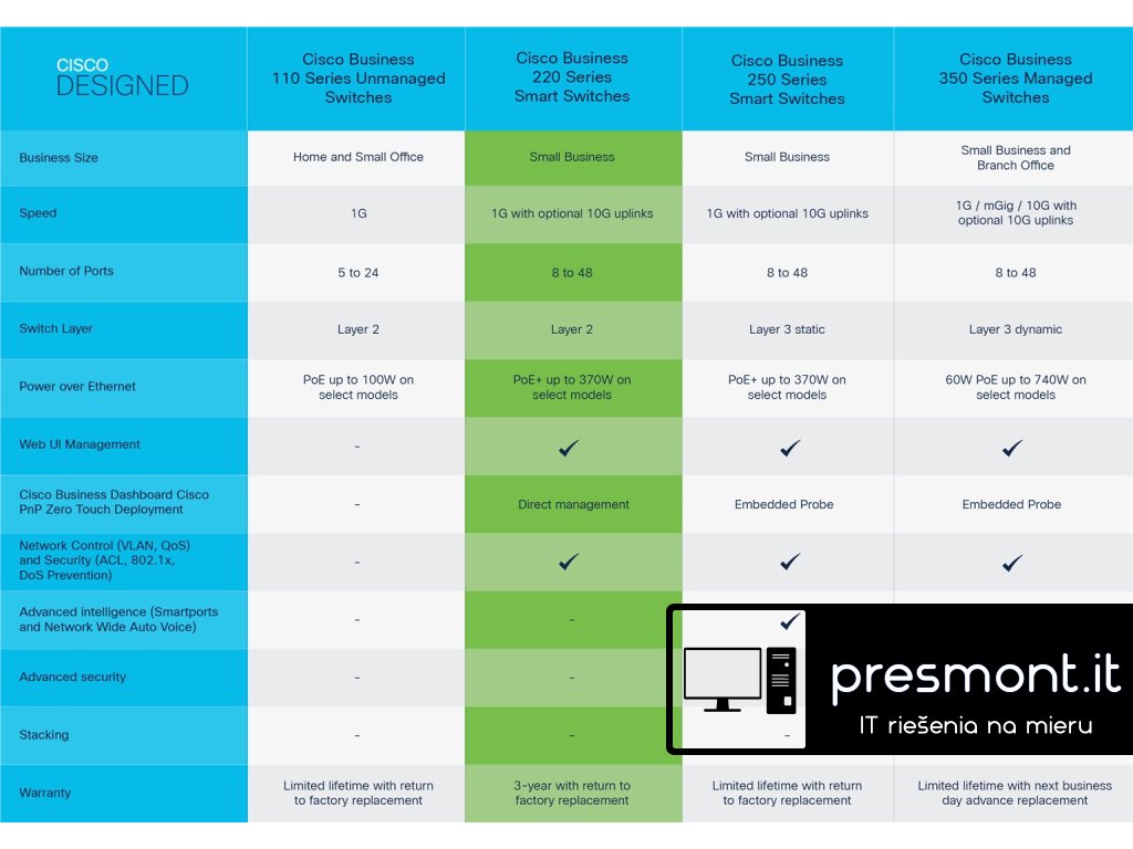 Alternativní označení produktu: „CBS220-48FP-4X-EU“, „CBS220-48FP-4X-EU-RF“ , „CBS220-48FP4XEU-RF“ CBS220-48FP-4X - Cisco Business 220 Ethernet Switch Řada Cisco Business 220 jsou cenově dostupné inteligentní přepínače se snadným použitím, zabezpečením a spolehlivostí pro sítě podnikové třídy. Díky intuitivnímu palubnímu panelu, možnostem napájení přes Ethernet (PoE) a přizpůsobitelným funkcím poskytují tyto přepínače spolehlivou obchodní síť v rámci vašich rozpočtových parametrů. Pokud potřebujete síť na špičkové úrovni a cena je nejvyšší prioritou, nabízí řada Cisco Business 220 vynikající řešení. Spolehlivost a výkon - Přepínače byly testovány, aby poskytovaly vysokou dostupnost a výkon, který uživatelé očekávají. Přepínače zrychlují časy přenosu souborů, udržují důležité obchodní aplikace k dispozici a pomáhají vašim zaměstnancům rychleji reagovat na zákazníky i na sebe navzájem. Napájení přes PoE - PoE + zjednodušuje nasazení bezdrátových přístupových bodů, IP telefonie a video dohledu tím, že umožňuje napájení a data přes jediný síťový kabel. Přepínače řady Cisco Business 220 podporují PoE +, který poskytuje až 30 wattů energie na port. Zabezpečení sítě - Rozsáhlé Acces Control Lists (ACL) mohou omezit citlivé části sítě před neoprávněnými uživateli a chránit před síťovými útoky. Prevence útoků typu Denial-of-Service (DOS) pomáhá prodloužit dobu provozu v případě síťového útoku. Optimální energetická účinnost - Přepínače jsou navrženy s podporou Energy Efficient Ethernet (IEEE 802.3az) a Energy Detect u všech modelů, stejně jako u vybraných modelů bez ventilátorů. Tyto návrhy vám pomohou ušetřit provozní náklady a snížit vaši ekologickou stopu. Snadná konfigurace a nasazení - Jednoduchá a intuitivní webová rozhraní umožňují uživatelům bez rozsáhlých odborných znalostí IT konfigurovat, spravovat a odstraňovat problémy s přepínači během několika minut. Průvodci konfigurací zjednodušují nejběžnější konfigurační úlohy a poskytují nástroj pro nastavení a správu sítě komukoli. PARAMETRY Přepínací kapacita: 176 Gbps Porty: 48x Gigabit ethernet RJ-45, 4x 10 G SFP+ Tabulka Mac adres: až 8 192 MAC adres Seskupení portů: až 8 portů na skupinu VLAN: podpora až 256 virtuálních lokálních sítí současně Rámec Jumbo: až 9 216 PoE: Ano Tlačítko: Reset Typ kabelu: Nestíněný kroucený pár (UTP) kategorie 5 nebo lepší pro 10BASE-T / 100BASE-TX LED: System, Akce, Rychlost Flash: 64 MB CPU memory: 256 MB Vyrovnávací paměť paketů: 16 Mb Rozměry: 440 x 350 x 44 mm Hmotnost: 5.65 kg Napájení: interní 100-240 V, 50-60 Hz Certifikace: UL, CSA, CE, FCC, C-tick Operační teplota: 0 - 50°C Skladovací teplota: -20°C až +70°C Provozní vlhkost: 10% až 90% Spotřeba energie: 110V=65,7W, 220V=64.4W Počet ventilátorů: 1 MTBF (hodin): 289,406 Obsah balení: - Cisco Business 220 switch - Napájecí kabel nebo adaptér - Montážní sada - Instalační příručka Odkaz na web výrobce: https://www.cisco.com/c/en/us/products/collateral/switches/business-220-series-smart-switches/datasheet-c78-744915.htmlDodatočné parametre