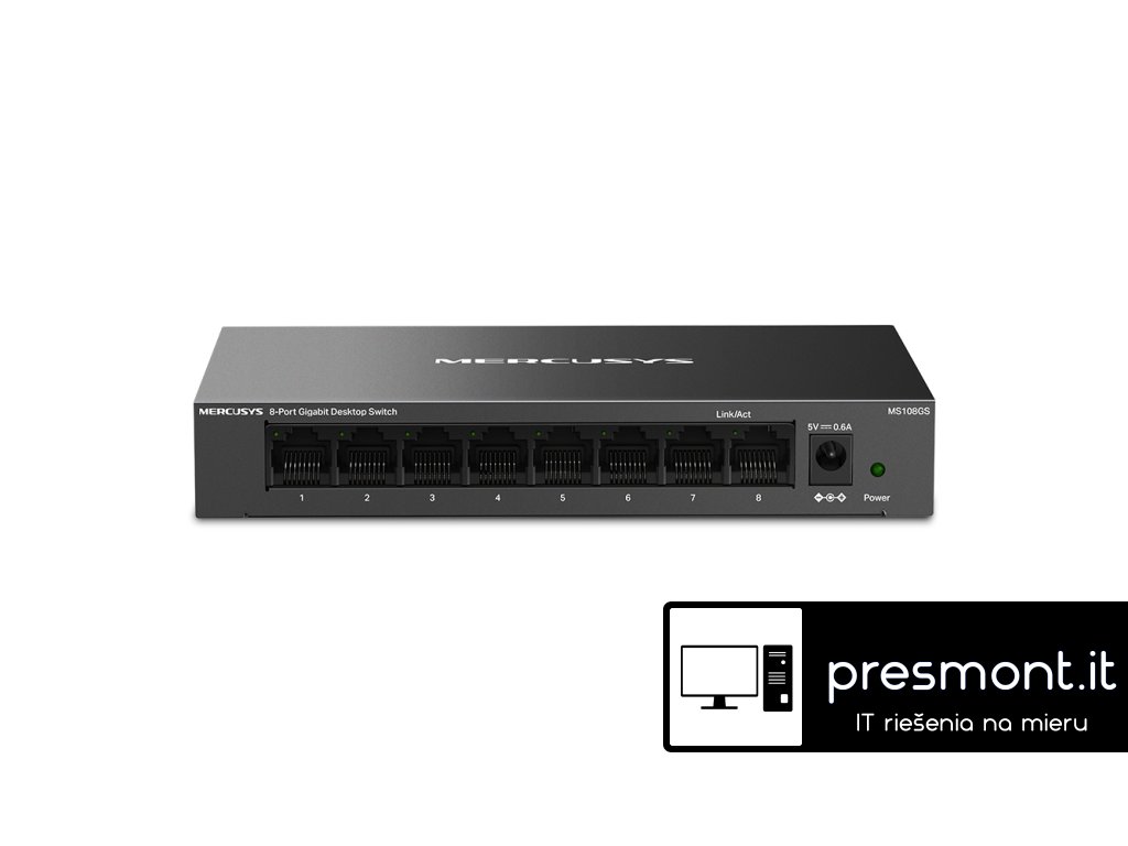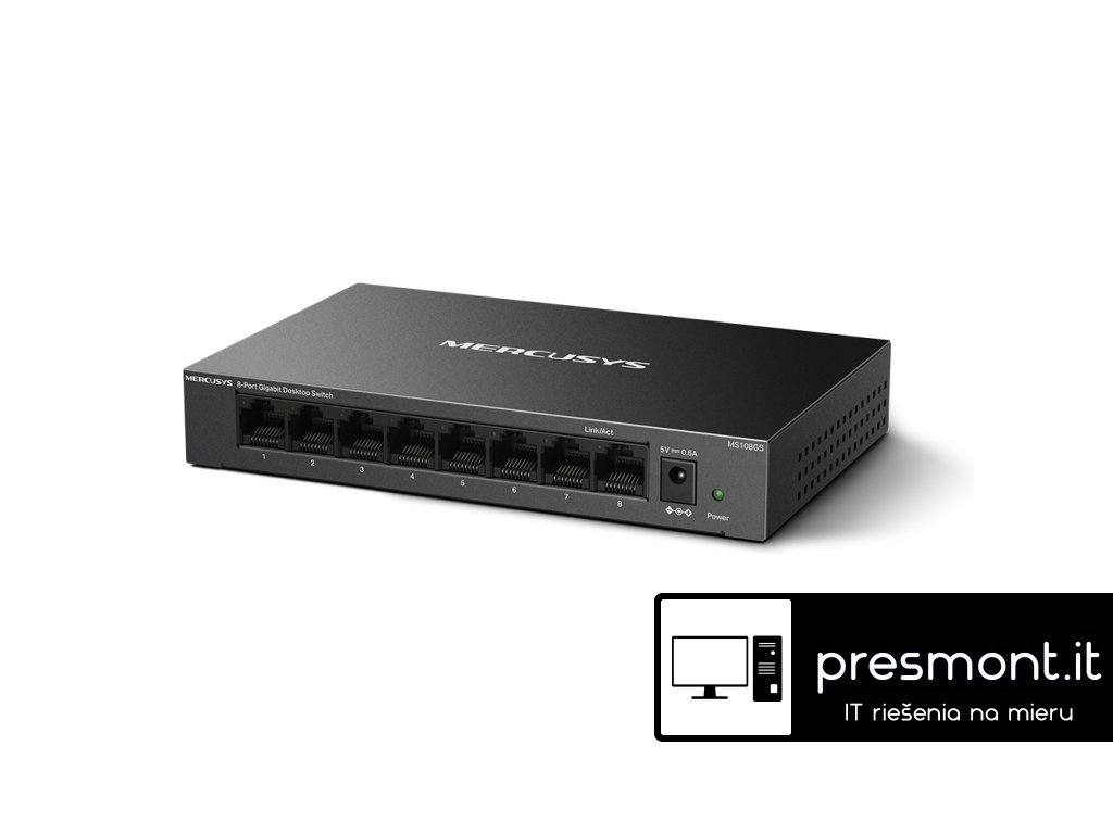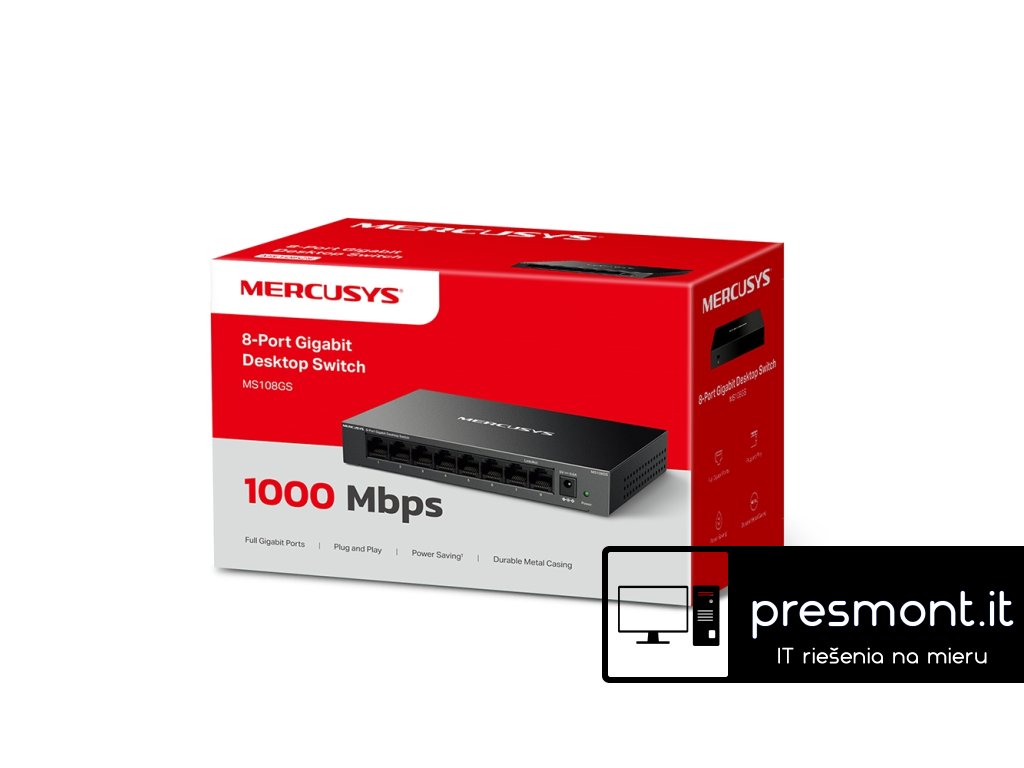 Mercusys MS108GS 8portový gigabitový stolní přepínač Kompaktní a spolehlivý gigabitový přepínač, který představuje ideální způsob, jak snadno rozšířit vaši kabelovou síť. S osmi vysokorychlostními porty je perfektním řešením pro připojení herních konzolí, chytrých televizorů, počítačů nebo tiskáren v domácnosti i malé kanceláři. Bezdrátová síť *Standard: IEEE 802.3, IEEE 802.3u, IEEE 802.3x, IEEE 802.3ab *Rychlost: 10/100/1000 Mb/s (Auto-Negotiation) *Zabezpečení: N/A (Transparentní přenos) *Vlastnosti: Podpora Auto-MDI/MDIX na všech portech (není potřeba křížený kabel) Výkon a kapacita *Počet portů: 8 *Kapacita přepínání: 16 Gb/s *Metoda přenosu: Store-and-Forward *Jumbo Frame: 9 KB *Technologie: Green Ethernet pro výraznou úsporu energie Porty a hardware *Ethernet porty: 8× 10/100/1000 Mb/s RJ45 porty *Napájení: 5V / 0,6A externí napájecí adaptér *Tlačítka: Žádná (Plug and Play zařízení) *LED: Indikace napájení a aktivity pro každý port Režimy provozu *Režim přepínače (Switch) *Plug and Play (bez nutnosti konfigurace) Zabezpečení *Zabezpečení: Fyzicky odolné plastové šasi *Ochrana: Spolehlivý provoz bez ventilátoru (zcela tichý chod) Software a správa *Správa: Unmanaged (neřiditelný) *Funkce: Řízení toku dat (Flow Control) pro stabilní přenos *Podpora protokolů: IPv4 / IPv6 Fyzické parametry *Rozměry (Š × H × V): 127 × 60,3 × 22 mm *Design: Ultra kompaktní stolní provedení s možností umístění na stůl Obsah balení *MS108GS: 1× 8portový gigabitový stolní přepínač, 1× napájecí adaptér, stručný návod Provozní podmínky *Provozní teplota: 0 °C až 40 °C *Vlhkost: 10 % až 90 % RH (nekondenzující) Odkaz na web výrobce: https://www.mercusys.com/cz/product/details/ms108gs/Dodatočné parametre