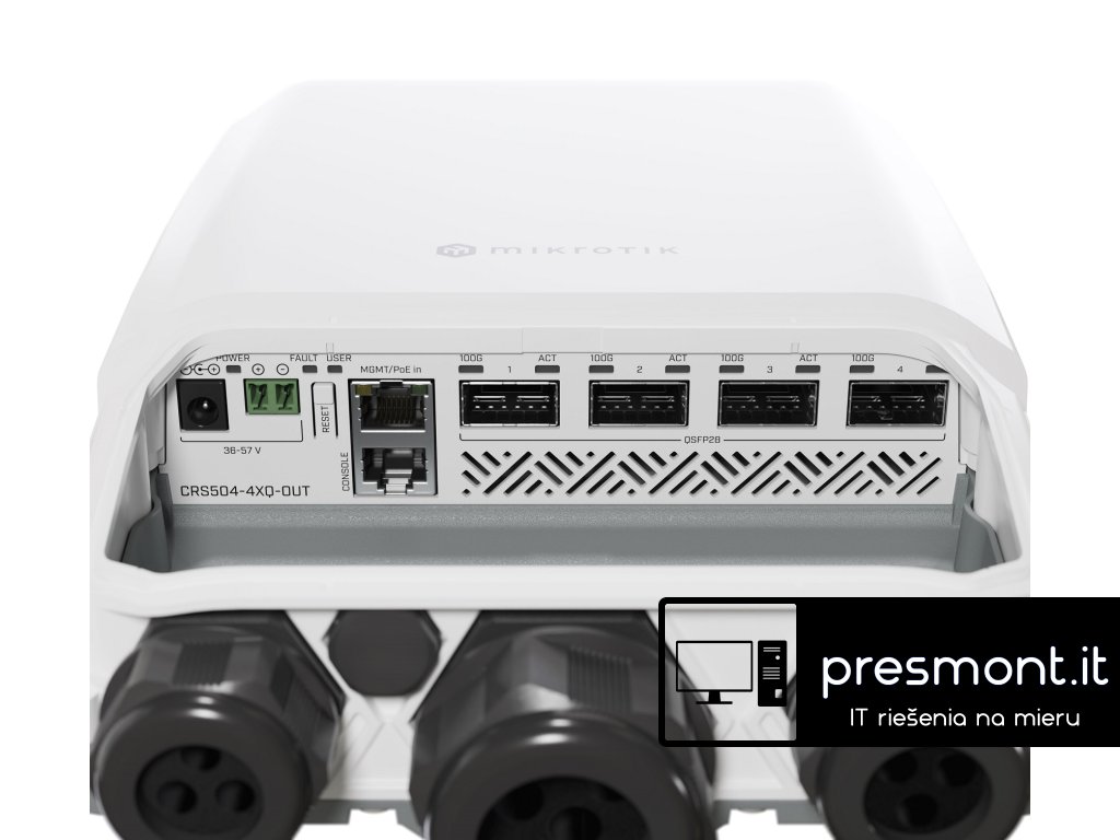 MikroTik CRS504-4XQ-OUT Cloud Router Switch * všestranný, ultra rychlý switch odolný vůči povětrnostním vlivům * možnost instalace na zeď či stožár * RouterOS v7 s licencí L5 a SwitchOS Specifikace Architektura: MIPSBE Procesor: QCA9531 Počet jader CPU: 1 Frekvence CPU: 650MHz Operační systém: RouterOS v7, úroveň licence 5 Velikost paměti RAM: 128MB Velikost úložiště: 32MB Napájení: PoE, DC konektor, DC svorkovnice (2-pin) Napájení přes PoE: 802.3bt, 43 .. 57V DC Napájení přes konektor/svorkovnici: 36 .. 57V DC Maximální spotřeba energie: 38W Ethernet: 10/100/1000Mbps (1x RJ-45) Optické rozhraní: 4x 100G QSFP28 Sériový port: 1x RJ45 Stupeň krytí: IP66 Rozměry: 330x200x70mm Obsah balení: * switch * gigabitový PoE injektor * napájecí adaptér 48V/0,95A * držáky na zeď, šroubky * kovová stahovací sponaDodatočné parametre