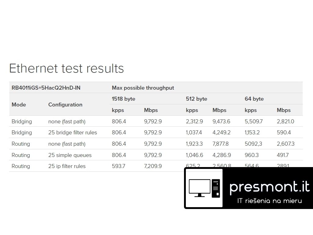 Systémové řešení platforem firmy MikroTik pro poskytovatele bezdrátového připojení k síti Internet. Nový model nové modelové řady RouterBoardů - RB4011iGS+5HacQ2HnD-IN disponuje čtyřmi jádry na frekvenci 1400 Mhz s integrovanou hardwarovou akcelerací. Integrovaný radiový dual band modul 2,4 i 5 GHz s podporou 4x4 MIMO a 10 Gbit porty s možností rozšíření o 10 Gbps modul přes SFP+ port. RB4011iGS+5HacQ2HnD-IN dokáže routovat až 2,5 Gbps, díky integrovanému akcelerátoru má v tunelu s robustním šifrování AES-256-CBC + SHA256 propustnost až 2 Gbps. V režimu switch zvládne RB přenášet data rychlostí až 9,7 Gbit. Je tak ideální v kombinaci s 10 Gbps miniGBIC modulem, kterým lze RouterBoard rozšířit v rámci integrovaného SFP+ portu. Další předností je podpora standardu 802.11ac, která společně s technologií 4x4 MIMO umožňuje bezdrátový přenost rychlostí až 1733 Mbps. Podporuje také pásmo 2,4 GHz s rychlostí až 300 Mbps. RouterBoard je osazen 3 dBi anténkami (4x 5 GHz, 2x dual band 2,4GHz) a disponuje výstupním výkonem až 33 dBm. RB4011iGS+5HacQ2HnD-IN nabízí: * vstupní i výstupní firewall * VPN koncentrátor * CAPsMAN server * pokročilý NAT * domácí AP s 2,4 i 5 GHz rádiem a podporou rychlosti přenosu až 1733 Mbps * tunely klient/server L2TP, IPsec, OpenVPN, PPTP, STTP, PPPoE, EoIP * jednoduché i pokročilé omezení rychlosti přes Queues a prioritizace služeb * Dynamické routování BGP, OSPF, RIP, MPLS a další * zakončení optické trasy 1/10 Gbps * switching a bridging * IPv6 síť Technické specifikace: Operační mód: AP, Client, WDS, Bridge, WISP Frekvence (GHz): 2,4, 5 Přenosová rychlost až (Mbps): 1733 Normy: 802.11a/b/g/n/ac Regulace výkonu: ano Max. výstupní výkon (dBm): 33 Citlivost (dBm): - 100 (1 mbps) až - 72 (MCS9) dBm LAN port: 10x 10/100/1000 Mbit/s Gigabit Ethernet, Auto-MDI/X Výchozí jméno: admin Firewall: Ano Rozhraní: LAN Zisk (dBi): 4x 3 dBi Procesor: AL21400 1.4 GHz with hardware encryption RAM (MB): 1000 NAND (MB): 512 Hmotnost (kg): 1,18 I/O Control: Ano LED indikace: ano OS: Mikrotik v6 - RouterOS Level 5 Podpora IPv6: Plná Výška (mm): 30 Šířka (mm): 228 Hloubka (mm): 120 Napájení max (jack) (V): 230 Napájení min (PoE) (V): 12 Napájení max (PoE) (V): 57 Provozní teplota min (°C): -20 Provozní teplota max (°C): 60 Upozornění: Výrobce MIKROTIK nevztahuje záruku na zařízení poškozená přepětím. Zařízení je třeba na vstupech adekvátně chránit proti indukovanému elektrostatickému přepětí či přepěťovým špičkám na silovém vedení. Při venkovních instalacích je třeba používat stíněnou kabeláž (FTP/SFTP), příslušné přepěťové ochrany (pokud nejsou integrovány) a provést korektní a efektivní uzemnění. Případným nerespektováním předepsaných instalačních postupů riskujete nevratná poškození aktivního prvku (vypálení ethernet chipu, poškození radiového miniPCI modulu).Dodatočné parametre