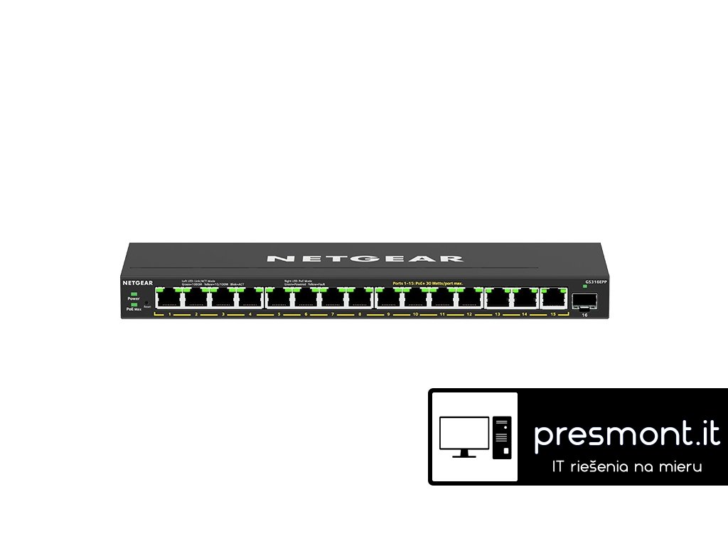 Netgear GS316EPP 16portový přepínač PoE+ Gigabit Ethernet Plus (231 W) s 1 portem SFP. NETGEAR 16-portový switch High-Power PoE+ Gigabit Ethernet Plus poskytuje základní funkce podnikové sítě a napájí zařízení PoE+, jako jsou telefony VoIP, IP kamery a další. *16 portů poskytuje až 1 000 Mb/s vyhrazené neblokující šířky pásma *15 portů PoE+ poskytuje celkem 231 W energie, takže můžete napájet a připojovat svá zařízení jediným kabelem *Správa priorit PoE, omezení napájení PoE na port, plánování PoE a další pro snadné ovládání všech zařízení napájených PoE *Neblokující přepínání *Design bez ventilátoru *Všestranné možnosti montáže Technické parametry *Porty: 15 x Gigabit Ethernet Plus, 1 x SFP *Celkový počet portů PoE+: 15 *Celkový rozpočet PoE+: 231 W *Nepřerušovaný PoE: Ano *Šířka pásma: 32 Gb/s *Max. počet položek Mac: 4K *Velikost vyrovnávací paměti: 192 kB *Energeticky efektivní ethernet (IEEE 802.3az): Ano *Prioritní řazení: WRR *Podpora rámce Jumbo: 10 000 bajtů *Rozměry: 286 x 102 x 27 mm *Hmotnost: 0,88 kg Odkaz na web výrobce: https://www.netgear.com/business/wired/switches/plus/gs316epp/Dodatočné parametre