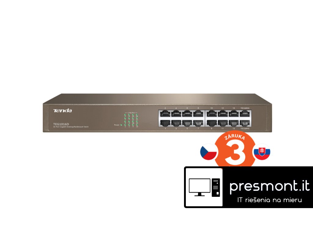 Tenda TEG1016D - 16x Gigabit Switch, Fanless-bez ventilátorov, Rackmount, ochrana proti prepätiu