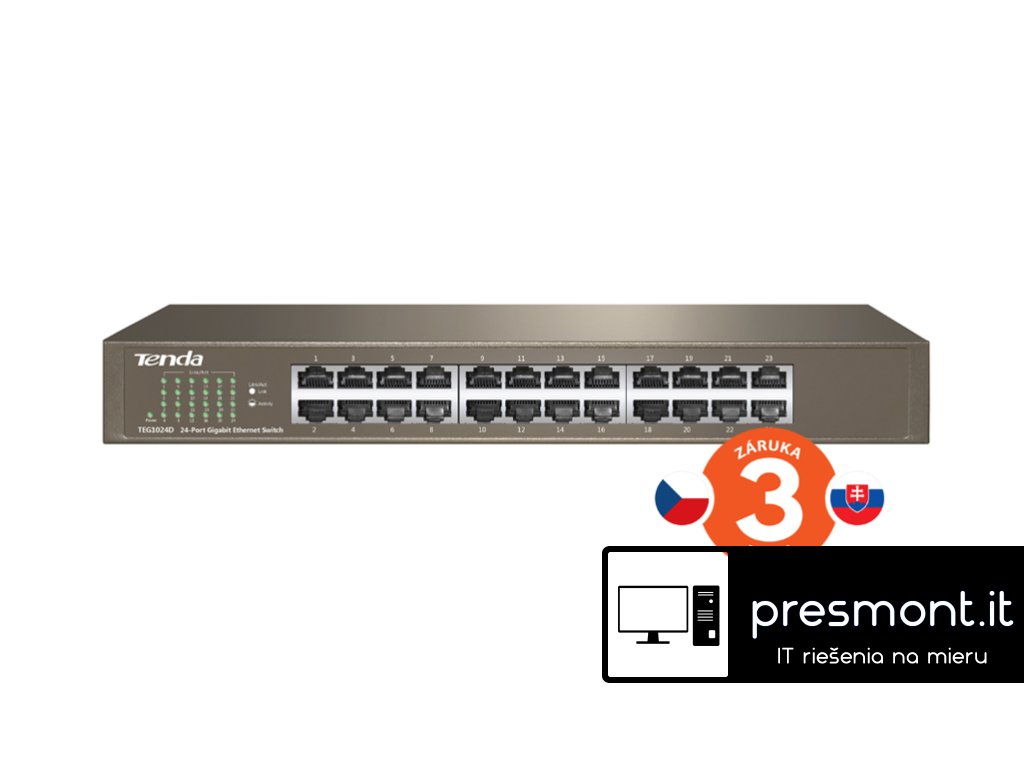 Tenda TEG1024D je 24 portový gigabitový desktop/rackmount switch. Fanless - bez ventilátorů. Auto MDI/MDIX. Ochrana proti přepětí 6000 V. Propustnost 48 Gb/s. Kovové provedení. Desktop nebo montáž do rozvaděče. Součástí balení je český, slovenský a polský manuál. Technické parametry Standarty&protokoly: IEEE 802.3, IEEE 802.3u, IEEE 802.3x, IEEE 802.3ab Porty: 24x 10/100/1000 Mb/s RJ45 Auto MDI/MDIX Forward. rychlost: 10 Mb/s: 14880pps/port, 100 Mb/s: 148800pps/port, 1000 Mb/s: 1488000 pps/port Celková propustnost: 48 Gb/s Velikost tabulky MAC adresace: 8K, auto aktualizace Mód přepínání: Store-And-Forward Chlazení: Fanless - bez ventilátorů, pasivní Ovládání: bez managementu Montáž do rozvaděče: ano, výška 1U LED Indikace: 24x Linka/Aktivita, 1x Napájení Spotřeba: 13 W Rozměry: 294 mm x 178 mm x 44 mm(L*W*H), výška 1U Pracovní teplota: 0oC ~ 40oC Vlhkost: 10%-90%RH (nekondenzující) Certifikace: FCC/CE/RoHS Popis produktu Tenda TEG1024D přepíná data pomocí 24 portů RJ45 s přenosovou rychlostí 10/100/1000 Mb/s s automatickou detekcí rychlosti. Switch disponuje ochranou proti přepětí 6000 V. Podpora přepojování uzlů v módu Store-and-Forward. Full-duplex kontrola toku 802.3x, half-duplex kontrola toku v režimu Back-Pressure. Maximální propustnost 48 Gb/s. Balení obsahuje kovové ''L'' držáky pro montáž do rozvaděče. Switch je napájen interním zdrojem TEG1024D je vhodná jak do menších a středních firem, tak i do domácností. Obsah balení 1x Tenda TEG1024D 2x Kovový ''L'' držák pro montáž do rozvaděče 1x Stručná instalační příručka (CZ, SK, PL) 1x Elektrická šňůra Více informací na www.tenda.czDodatočné parametre