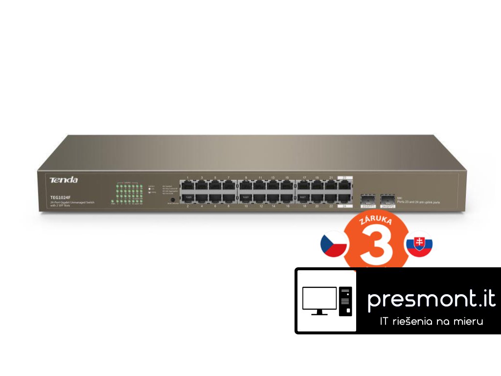 Tenda TEG1024F je 24ti portový Gigabitový Ethernet switch s 2x SFP sloty. 22 portů 10/100/1000 Mb/s + 2x Combo SFP/RJ45 1000 Mb/s. Fanless, bez ventilátorů. Rackmount, velikost switche 19''. Ochrana proti přepětí 6 kV. Přepínání VLAN, Aggregation, Flow Control, Standart. Kovový obal. Součástí balení je český, slovenský a polský manuál. Technické parametry Standarty&protokoly: IEEE802.3, IEEE802.3u, IEEE802.3ab, IEEE802.3x, IEEE802.3z Porty: 24x 10/100/1000 Mb/s porty Base-T RJ45 auto-negace, 2x Combo 1000 Mb/s Base-X SFP Celková propustnost: 48 Gb/s Velikost tabulky MAC adresace: 8K, Auto-learning, Auto-agging Mód přepínání: Store-And-Forward, protokol CDMA/CD LED Indikace: 24x Linka/Aktivita portu, 4x Přepínání módu, 1x Napájení Level přepěťové ochrany: - pro porty: 6kV, - pro napájení: 6kV, ESD: vzduch: ±10kV, kontakt: ±8kV Buffer: 2M Packet forwarding rate: 35,6 Mp/s Napájení: 100 až 240 V, AC Spotřeba: max. 13 W Rozměry: 440mm x 178mm x 44mm(L*W*H) Ochrana proti přepětí: 6 000 V Ventilátory: ne, fanless Umístění: rackmount 19'', na stěnu, desktop MTBF: 100 000 hodin+ Pracovní teplota: 0oC ~ 45oC Vlhkost: 10%-90%RH (nekondenzující) Certifikace: FCC/CE/RoHS Popis produktu Tenda TEG1024F přepíná data pomocí 24 portů RJ45 a 2 portů SFP pro připojení optiky, 22 portů 10/100/1000 Mb/s RJ45 + 2x Combo SFP/RJ45 (SFP rychlost 1000Mb/s a RJ45 rychlost 10/100/1000 Mb/s). Switch má ochranu proti přepětí 6kV. Podpora přepojování uzlů v módu Store-and-Forward. Full-duplex kontrola toku 802.3x, navíc podporuje energeticky úspornou normu 802.3z. Tenda TEG1024F je vhodná jak do menších a středních firem, tak i do větších domácností. Switch je možné nastavit do 4 různých módů provozu. Navíc je switch tichý, zcela bez ventilátorů, fanless. Přepínač M1-M4 - Standard / Flow Control Off / Link Aggregation / Port-based VLAN Tenda TEG1024F obsahuje přepínač pro výběr ze čtyř režimů: - M1 Standart: V tomto módu pracuje jako klasický switch, veškeré porty mají auto-negaci, všechny porty spolu komunikují. - M2 Flow Control Off: V tomto módu je na všech portech vypnuta funkce Flow Control, například pro použití v internetových kavárnách apod. - M3 Link Aggregation: Porty 23 a 24 vytvoří společně agregační uplink linku (LAG). Veškeré datové toky jsou směřovány do této Uplink linky. - M4 Port-based VLAN: V tomto módu jsou Port1 až Port22 izolovány samy od sebe, každý port Port1 až Port22 může komunikovat jen s uplink Port23 a Port24. Zabraňuje velkému šíření broadcastů a DHCP spoofingu. Kompatibilita s SFP moduly Tenda TEG1024F je kompatibilní se všemi SFP moduly o rychlosti 1000Mb/s které jsou Cisco kompatibilní. Ze značek můžeme doporučit SFP Signamax. Obsah balení 1x Tenda TEG1024F 1x sada ''L'' držáků pro ukotvení do racku 1x Stručná instalační příručka (CZ, SK, PL, EN) 1x Napájecí kabel 230V Více informací na www.tenda.czDodatočné parametre
