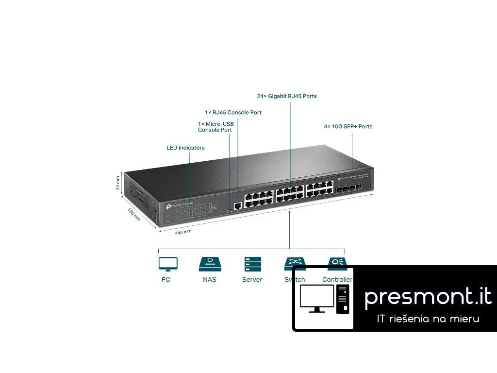 TL-SG3428X-UPS JetStream™ 24-Port Gigabit L2+ Managed Switch with 4 10GE SFP+ Slots and UPS Power Supply PORT: 24× Gigabit RJ45 Ports, 4× 10G SFP+ Slots, RJ45/Micro-USB Console Port SPEC: 1U 19-inch Rack-mountable Steel Case FEATURE: Static Routing, OAM, sFlow, DDM, 802.1Q VLAN, QinQ, STP/RSTP/MSTP, IGMP Snooping, 802.1p/DSCP QoS, ACL, 802.1x, Radius/Tacacs+ Authentication, LACP, CLI, SNMP, Dual Image/Configuration, IPv6Dodatočné parametre