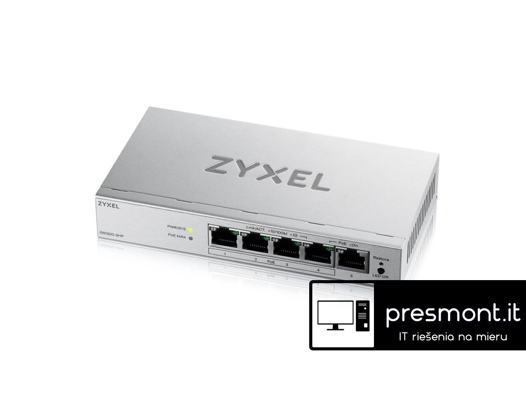 Zyxel 5-Port GbE PoE Web Managed Switch Zyxel 5-Port GbE PoE Web Managed Switch je ideální řešení pro malé sítě, které vyžadují napájení přes Ethernet (PoE). Tento Web Managed switch nabízí 5 portů 10/100/1000 Mbps RJ-45, z toho 4 porty podporují PoE+ s celkovým rozpočtem 68 W. Správa přes webové rozhraní je jednoduchá a přehledná. Switch poskytuje switching capacity 10 Gbps a forwarding rate 7,44 Mpps, s MAC tabulkou pro 4 000 adres a podporou Jumbo frame 15 KB. Je vybaven technologií Energy-Efficient Ethernet a fanless konstrukcí, díky čemuž je provoz tichý a energeticky úsporný. Napájení je externí, podporuje PoE+ (IEEE 802.3at) a zařízení zvládá široký rozsah provozních teplot 0–40 °C. S dlouhou životností (MTBF 1 730 334 hodin) a kompaktními rozměry (155 × 85 × 26 mm) se snadno integruje do kancelářského nebo domácího prostředí. Hlavní vlastnosti * Web Managed – snadná správa přes webové rozhraní * 5 GbE portů – 4× PoE+ porty, 1× uplink * Celkový PoE rozpočet: 68 W * Switching capacity: 10 Gbps * Forwarding rate: 7,44 Mpps * Packet buffer: 192 KB * MAC address table: 4 000 položek * Jumbo frame: 15 KB * Fanless – tichý provoz * Energy-Efficient Ethernet – úsporný provoz Technické parametry Porty a PoE * 5× 10/100/1000 Mbps RJ-45 * PoE+ porty: 4 * Celkový PoE rozpočet: 68 W Výkon * Switching capacity: 10 Gbps * Forwarding rate: 7,44 Mpps * Packet buffer: 192 KB * MAC address table: 4 000 položek * Jumbo frame: 15 KB Napájení * Vstup: 100–240 V AC, 50/60 Hz * Externí napájecí adaptér * Minimální spotřeba: 1,779 W * Maximální spotřeba (bez PoE, všechny porty pod zátěží): 4,153 W * Maximální spotřeba (s PoE, všechny porty plně zatíženy): 81,126 W Fyzické parametry * Rozměry: 155 × 85 × 26 mm * Hmotnost: 0,274 kg * Fanless konstrukce – tichý provoz Provozní a environmentální parametry * Provozní teplota: 0–40 °C * Skladovací teplota: -40–70 °C * Provozní vlhkost: 10–95 % (nekondenzující) * Skladovací vlhkost: 10–95 % (nekondenzující) * MTBF: 1 730 334 hodin * Heat dissipation: 44,788 BTU/h * Akustický hluk: 0 dBA (fanless) Odkaz na web výrobce: https://www.zyxel.com/cz/cs/products/switch/5-port-8-port-gbe-web-managed-switch-gs1200v3-series/specificationsDodatočné parametre