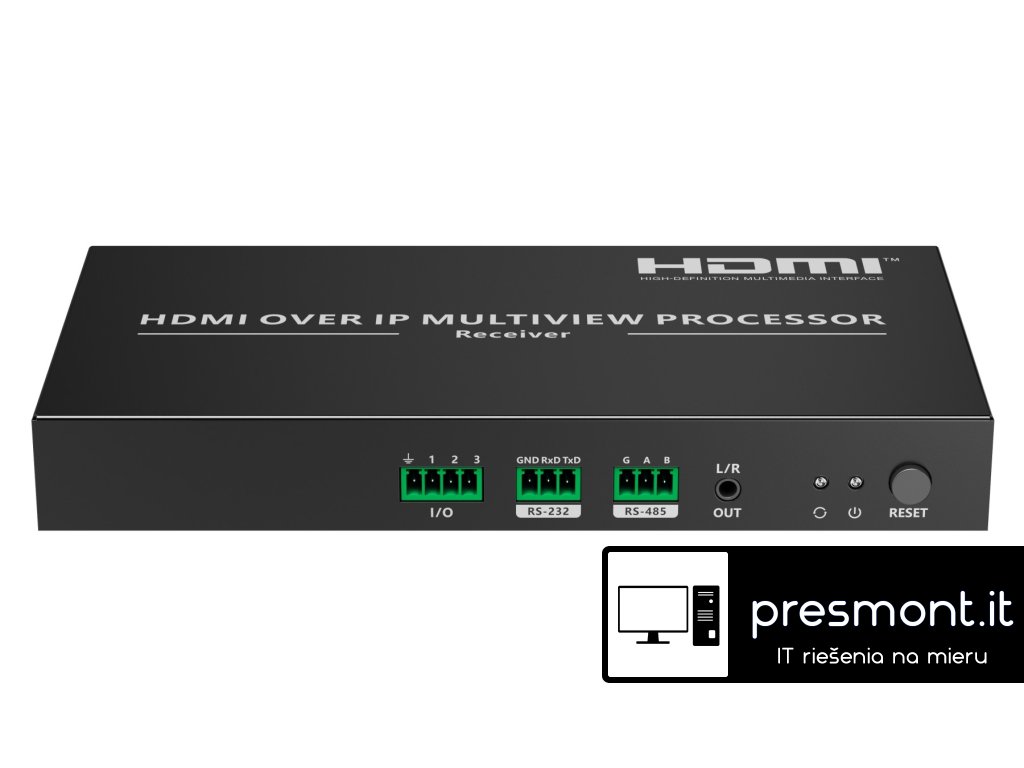 PremiumCord 4K HDMI over IP Matrix přijímač pro zobrazení více obrazů na jednom monitoru. Tento přijímač spolupracuje s vysílači kód: khext80-TX a může pracovat ve společné matrici. Zařízení umožňuje prostřednictvím 1G sítě propojit více zdrojů HDMI signálu a zobrazovat více obrazů najednou na jednom monitoru. Nastavování lze pomocí APP. - Přijímač Multiview Processor umožňuje použití více vysílačů v 1G síti a zobrazit více obrazů na jednom monitoru. - Podporuje rozlišení 4K@60Hz 3840×2160 při 60 Hz.až na 120m - Rozlišení:4096x2160@24/30Hz, 3840x2160@24/30/50/60Hz,1080p@50/60Hz,720p@50/60Hz, 1920x1200@60Hz,2560x1440@60Hz - Přenosová rychlost:18Gbps - Podporuje: HDCP 1.4/HDCP 2.2 - Postaveno na technologii ipcolor STREAM™ pro přenos ve vysokém rozlišení a s nízkou latencí. - Nastavení více obrazů na jednom monitoru lze řídit APP aplikací - Po připojení k matici iMCS over IP podporuje současný příjem a zpracování více signálů. Ve spojení s aplikací iMCS umožňuje dálkové ovládání zobrazení na obrazovce, zobrazení na čtyřech a devíti panelech a také úpravu velikosti a polohy zobrazení. - Kompatibilní se síťovými kabely Cat5e/6 nebo vyšší úrovně, přenosová vzdálenost kabelu CAT6 je 120 m. - Podporuje připojení typu jeden k jednomu nebo mnoho k mnoha prostřednictvím gigabitového přepínače. - Podporuje oddělení zvuku 3,5 mm L/R kanálu. - Podporuje jednosměrné IR ovládání (20~60 kHz) - Podporuje IR učící se dálkové ovládání a ovládání zařízení pomocí aplikace - Vytváření víceobrazovkového spojení s videostěnou až 5×5 (včetně také 1×1 / 1×2 / 1×3 / 1×4 / 1×5 / 2×1 / 2×2 / 2×3 / 2×4 / 2×5 / 3×1 / 3×2 / 3×3 / 3×4 / 3×5 / 4×1 / 4×2 / 4×3 / 4×4 / 4×5 / 5×1 / 5×2 / 5×3 / 5×4 / 5×5) pomocí přepínače a ovládané aplikací. Podporuje 256 vstupů signálových zdrojů a 256 výstupů signálu, což poskytuje flexibilní konfiguraci matice typu „mnoho k mnoha“ (při připojení více než 100 vysílačů a přijímačů vyžaduje ovládání pomocí aplikace). - Matrix extender přenáší obraz, zvuk. - Aktualizace firmwaru přes port Micro USB - Ochrana proti blesku, přepětí a ESD - Stabilní provoz 24/7 - Pracovní teplota:- 20°C~60°C - Napájení ze zdroje v setu 5V 8W - Kovové pouzdro - Barva: černá - Rozměry vysílače:délka:191mm, šířka:96mm, výška:25mm - Váha: 518 g V balení: 1x Jednotka přijímače 1x Manuál 1x Napájecí adaptér link pro stažení ovládací aplikace https://www.ipcolor.org/download.htmlDodatočné parametre