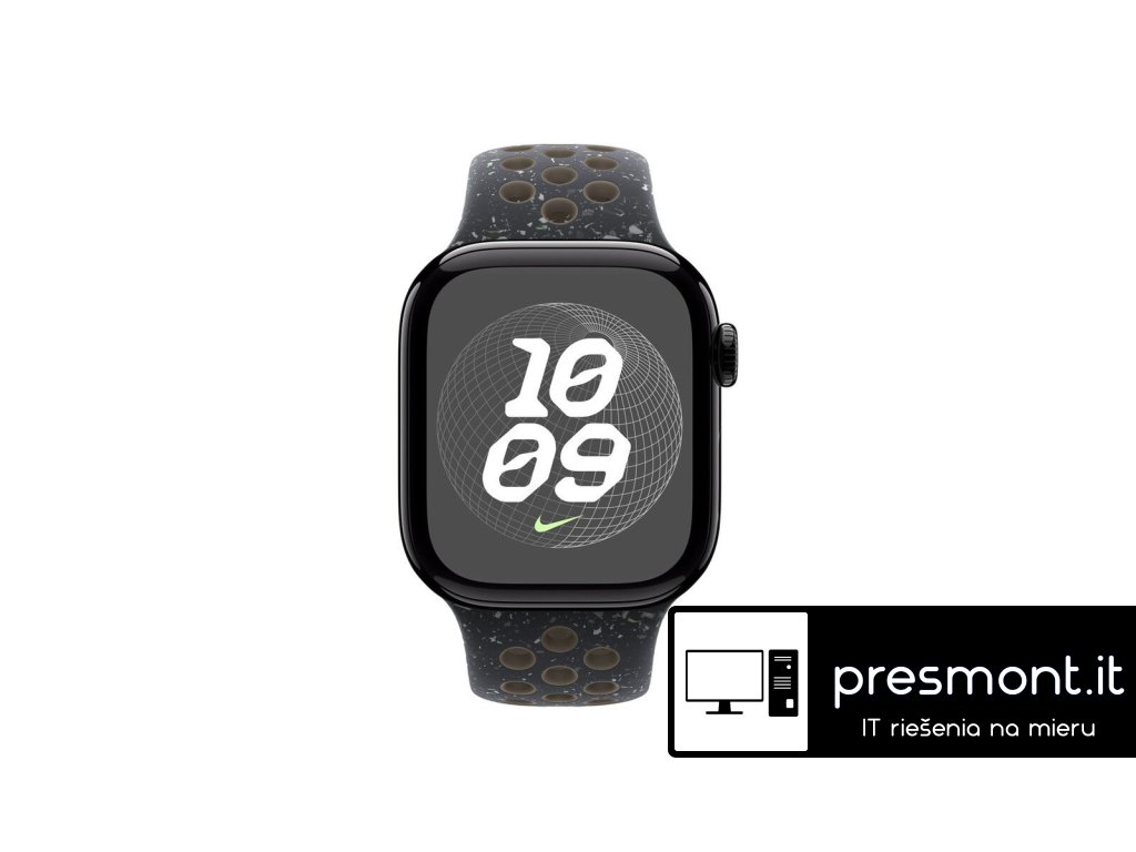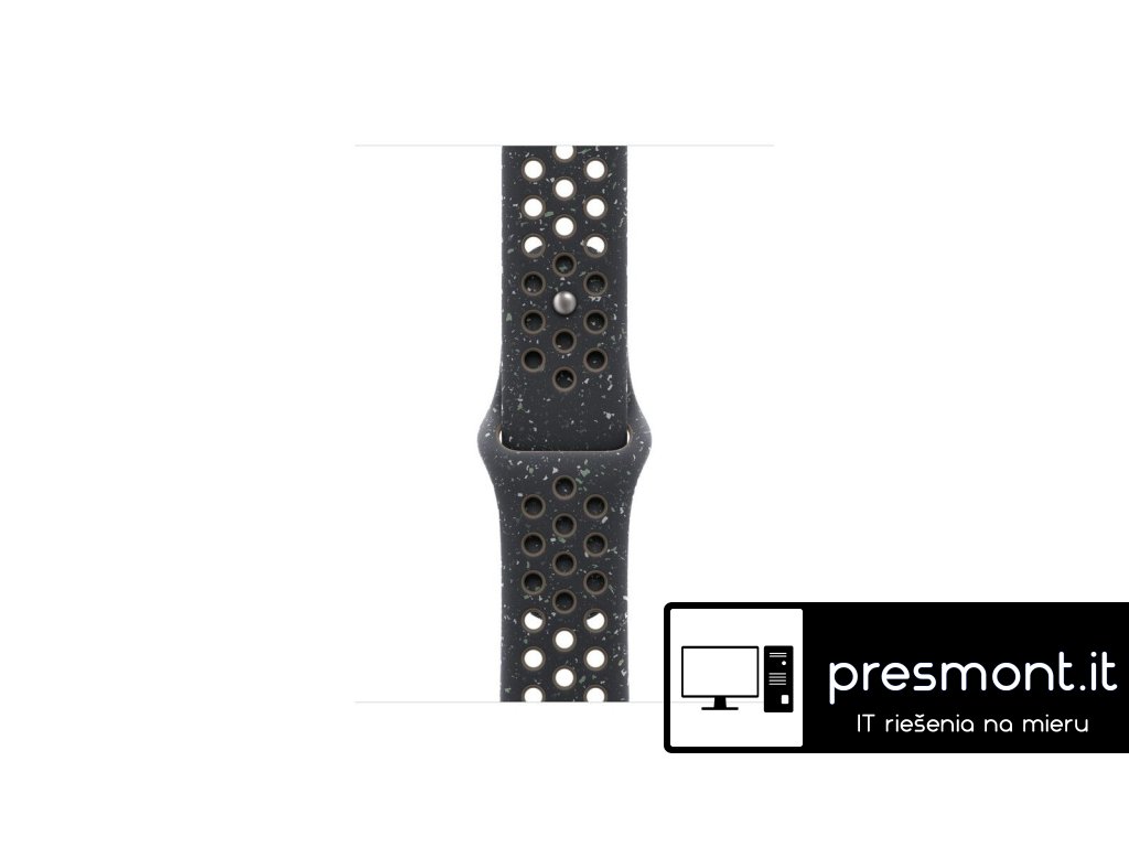 Apple 40mm sportovní řemínek Nike Tenhle sportovní řemínek Nike má vylisované otvory pro větší vzdušnost, je odolný, pevný a přitom krásně poddajný. Obsahuje barevné vločky vytvářející náhodné vzory, takže každý řemínek je originál. Jeho hladký, hutný materiál se elegantně ovine kolem zápěstí a příjemně sedí. A nově se zapíná na hliníkový kolíček s matným povrchem. Řemínek obsahuje minimálně 30 % recyklovaného fluoroelastomeru, přičemž obsah recyklovaného fluoroelastomeru v každé vločce je minimálně 66 %. V krabici Sportovní řemínek Nike k Apple Watch Technické specifikace Materiál: Fluoroelastomer Barva: Midnight Sky Nike Velikost: M/L Kompatibilita - Modely Apple Watch * 38 mm * 40 mm * 41 mmDodatočné parametre