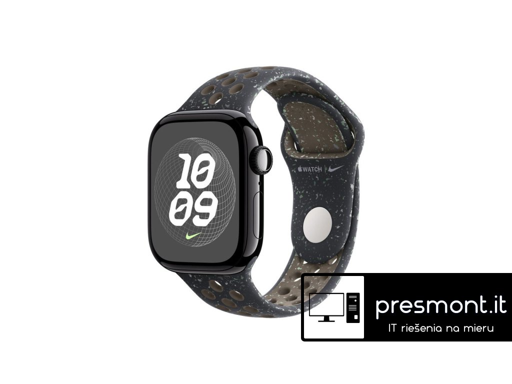 Apple 40mm sportovní řemínek Nike Tenhle sportovní řemínek Nike má vylisované otvory pro větší vzdušnost, je odolný, pevný a přitom krásně poddajný. Obsahuje barevné vločky vytvářející náhodné vzory, takže každý řemínek je originál. Jeho hladký, hutný materiál se elegantně ovine kolem zápěstí a příjemně sedí. A nově se zapíná na hliníkový kolíček s matným povrchem. Řemínek obsahuje minimálně 30 % recyklovaného fluoroelastomeru, přičemž obsah recyklovaného fluoroelastomeru v každé vločce je minimálně 66 %. V krabici Sportovní řemínek Nike k Apple Watch Technické specifikace Materiál: Fluoroelastomer Barva: Midnight Sky Nike Velikost: S/M Kompatibilita - Modely Apple Watch * 38 mm * 40 mm * 41 mmDodatočné parametre