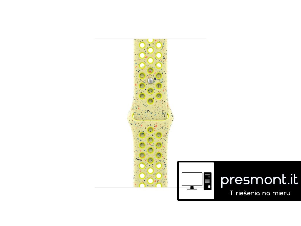Apple 40mm sportovní řemínek Nike Tenhle sportovní řemínek Nike má vylisované otvory pro větší vzdušnost, je odolný, pevný a přitom krásně poddajný. Obsahuje barevné vločky vytvářející náhodné vzory, takže každý řemínek je originál. Jeho hladký, hutný materiál se elegantně ovine kolem zápěstí a příjemně sedí. A nově se zapíná na hliníkový kolíček s matným povrchem. Řemínek obsahuje minimálně 30 % recyklovaného fluoroelastomeru, přičemž obsah recyklovaného fluoroelastomeru v každé vločce je minimálně 66 %. V krabici Sportovní řemínek Nike k Apple Watch Technické specifikace Materiál: Fluoroelastomer Barva: Volt Splash Velikost: S/M Kompatibilita - Modely Apple Watch * 38 mm * 40 mm * 41 mmDodatočné parametre