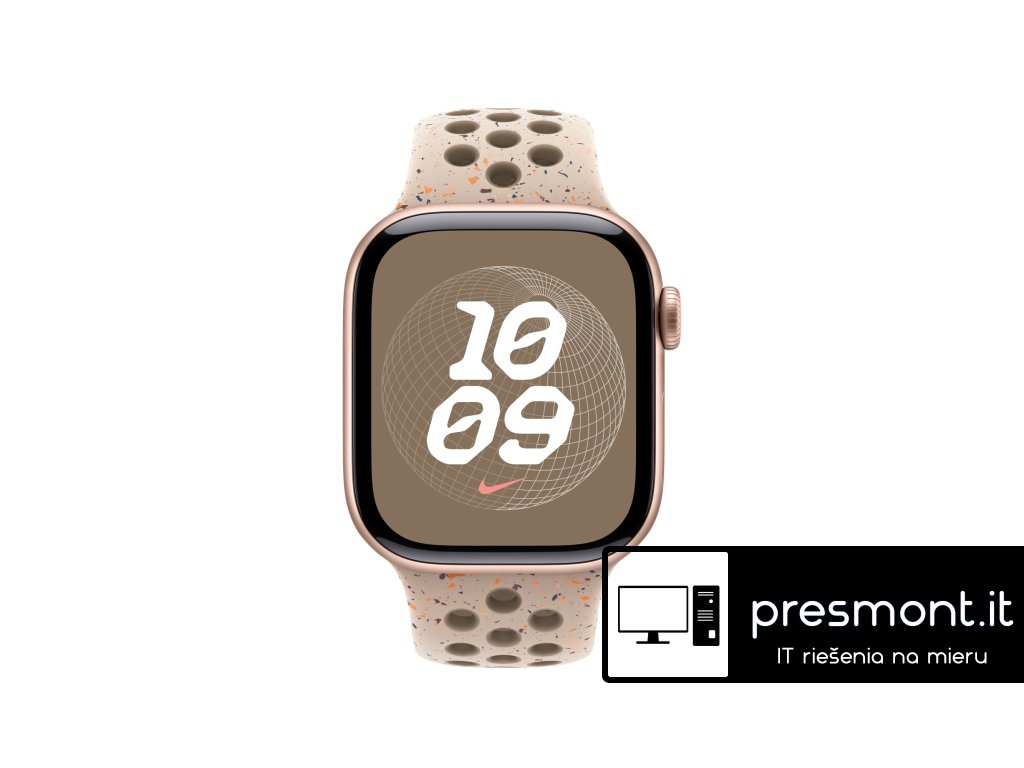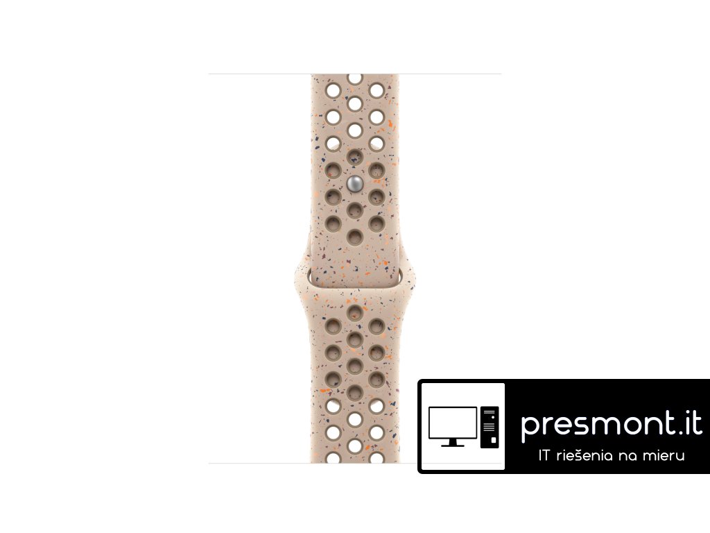 Apple 42mm sportovní řemínek Nike – S/M Tenhle sportovní řemínek Nike má vylisované otvory pro větší vzdušnost, je odolný, pevný a přitom krásně poddajný. Obsahuje barevné vločky vytvářející náhodné vzory, takže každý řemínek je originál. Jeho hladký, hutný materiál se elegantně ovine kolem zápěstí a příjemně sedí. A nově se zapíná na hliníkový kolíček s matným povrchem. Řemínek obsahuje minimálně 30 % recyklovaného fluoroelastomeru, přičemž obsah recyklovaného fluoroelastomeru v každé vločce je minimálně 66 %. V krabici Sportovní řemínek Apple Watch Nike Technické specifikace Materiál: Hliník, Minimálně 30 % recyklovaného fluoroelastomeru Barva: Desert Stone Nike Velikost řemínku: 130 - 180 mm Kompatibilita - Modely Apple Watch * 38 mm * 40 mm * 41 mm * 42 mmDodatočné parametre