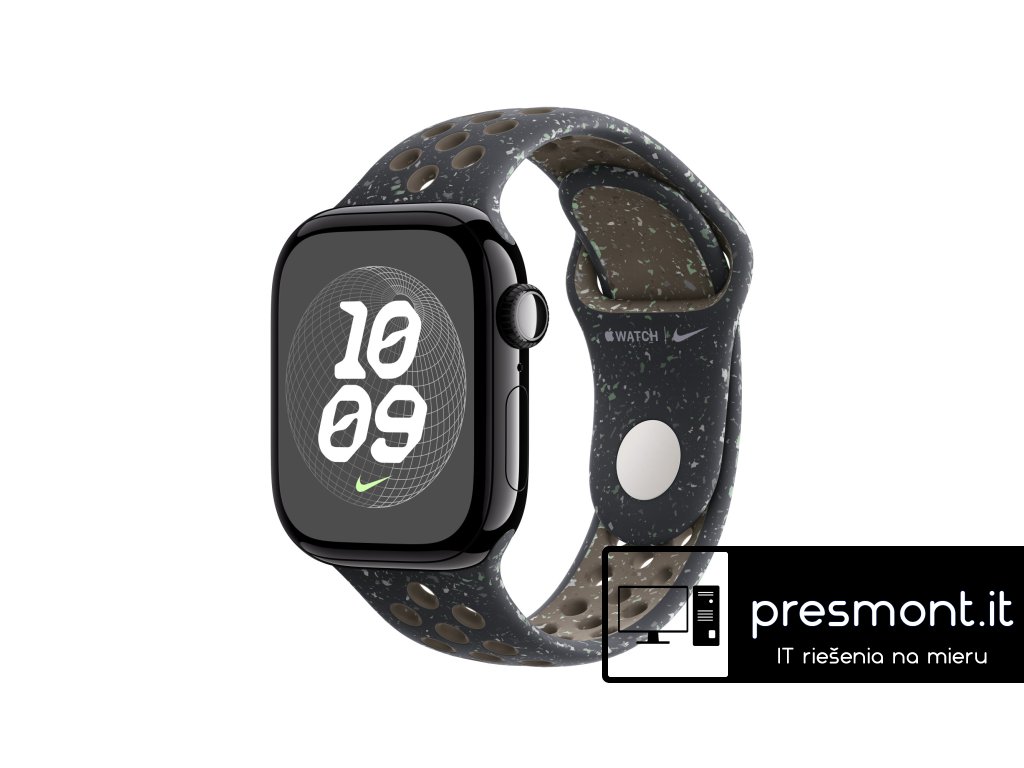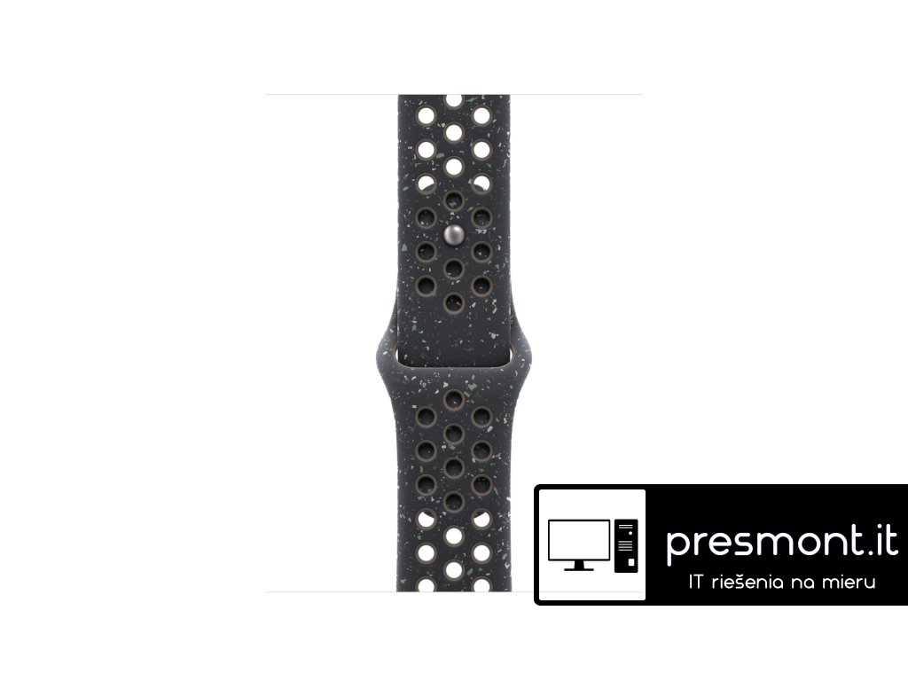 Apple 42mm sportovní řemínek Nike – S/M Tenhle sportovní řemínek Nike má vylisované otvory pro větší vzdušnost, je odolný, pevný a přitom krásně poddajný. Obsahuje barevné vločky vytvářející náhodné vzory, takže každý řemínek je originál. Jeho hladký, hutný materiál se elegantně ovine kolem zápěstí a příjemně sedí. A nově se zapíná na hliníkový kolíček s matným povrchem. Řemínek obsahuje minimálně 30 % recyklovaného fluoroelastomeru, přičemž obsah recyklovaného fluoroelastomeru v každé vločce je minimálně 66 %. V krabici Sportovní řemínek Apple Watch Nike Technické specifikace Materiál: Hliník, Minimálně 30 % recyklovaného fluoroelastomeru Barva: Midnight Sky Nike Velikost řemínku: 130 - 180 mm Kompatibilita - Modely Apple Watch * 38 mm * 40 mm * 41 mm * 42 mmDodatočné parametre