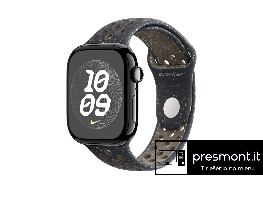 Apple 46mm sportovní řemínek Nike – M/L Tenhle sportovní řemínek Nike má vylisované otvory pro větší vzdušnost, je odolný, pevný a přitom krásně poddajný. Obsahuje barevné vločky vytvářející náhodné vzory, takže každý řemínek je originál. Jeho hladký, hutný materiál se elegantně ovine kolem zápěstí a příjemně sedí. A nově se zapíná na hliníkový kolíček s matným povrchem. Řemínek obsahuje minimálně 30 % recyklovaného fluoroelastomeru, přičemž obsah recyklovaného fluoroelastomeru v každé vločce je minimálně 66 %. V krabici Sportovní řemínek Apple Watch Nike Technické specifikace Materiál: Hliník, Minimálně 30 % recyklovaného fluoroelastomeru Barva: Midnight Sky Nike Velikost řemínku: 160 - 210 mm Kompatibilita - Modely Apple Watch * 44 mm * 45 mm * 46 mm * 49 mmDodatočné parametre