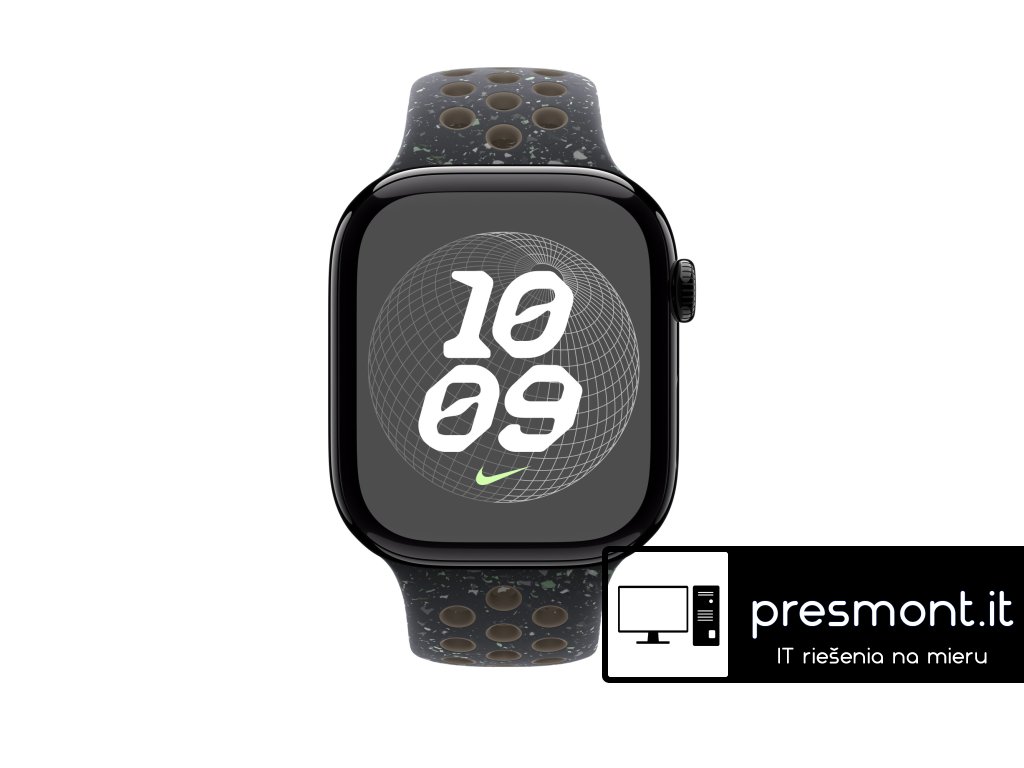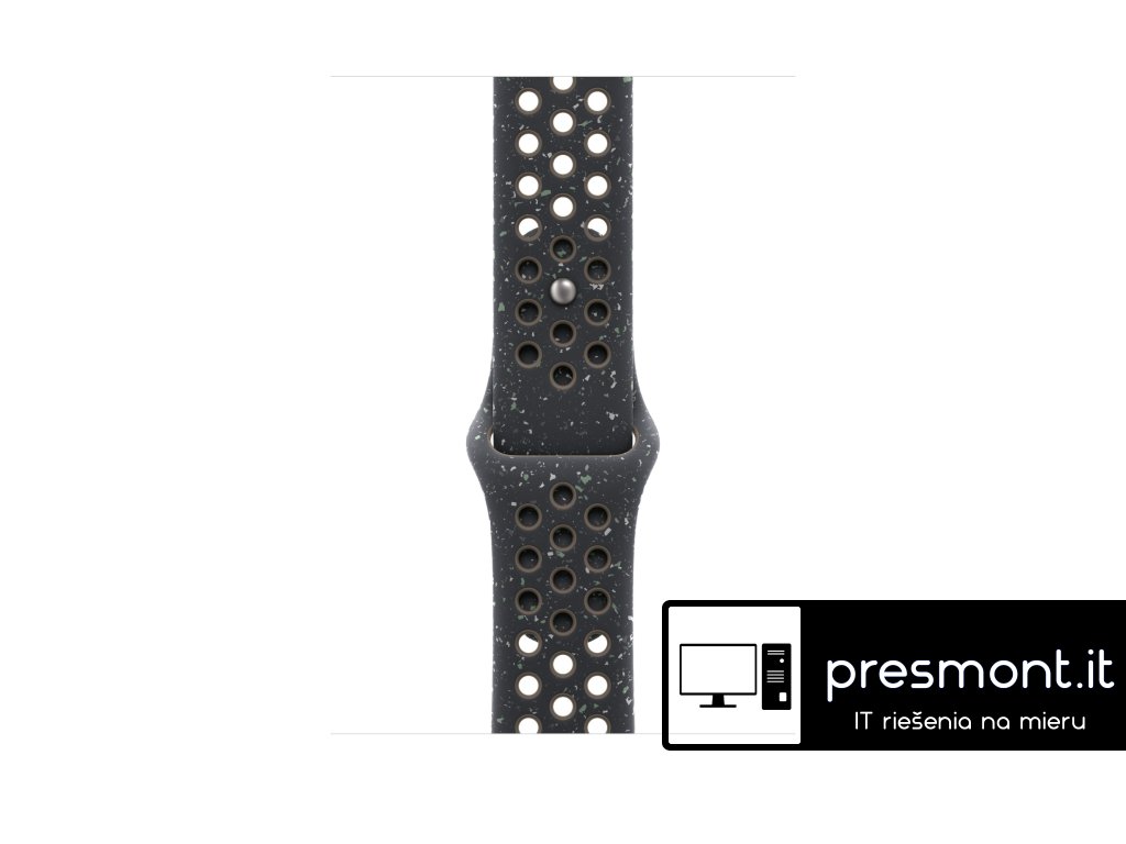 Apple 46mm sportovní řemínek Nike – S/M Tenhle sportovní řemínek Nike má vylisované otvory pro větší vzdušnost, je odolný, pevný a přitom krásně poddajný. Obsahuje barevné vločky vytvářející náhodné vzory, takže každý řemínek je originál. Jeho hladký, hutný materiál se elegantně ovine kolem zápěstí a příjemně sedí. A nově se zapíná na hliníkový kolíček s matným povrchem. Řemínek obsahuje minimálně 30 % recyklovaného fluoroelastomeru, přičemž obsah recyklovaného fluoroelastomeru v každé vločce je minimálně 66 %. V krabici Sportovní řemínek Apple Watch Nike Technické specifikace Materiál: Hliník, Minimálně 30 % recyklovaného fluoroelastomeru Barva: Midnight Sky Nike Velikost řemínku: 140 - 190 mm Kompatibilita - Modely Apple Watch * 44 mm * 45 mm * 46 mm * 49 mmDodatočné parametre