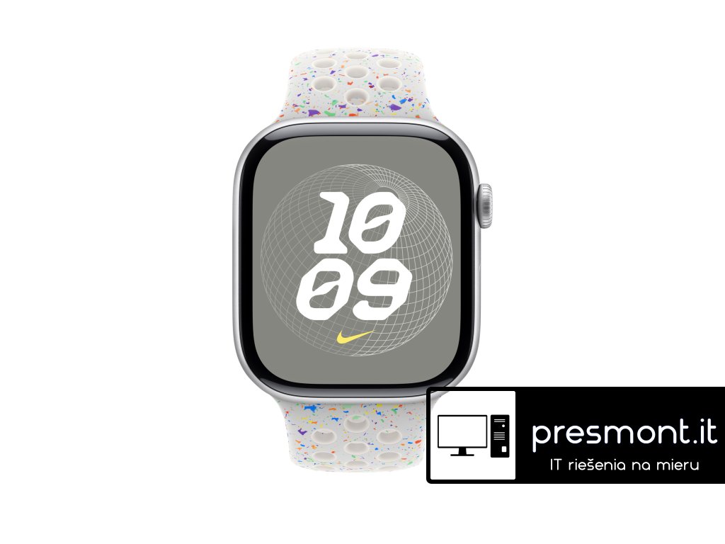 Apple 46mm sportovní řemínek Nike – M/L Tenhle sportovní řemínek Nike má vylisované otvory pro větší vzdušnost, je odolný, pevný a přitom krásně poddajný. Obsahuje barevné vločky vytvářející náhodné vzory, takže každý řemínek je originál. Jeho hladký, hutný materiál se elegantně ovine kolem zápěstí a příjemně sedí. A nově se zapíná na hliníkový kolíček s matným povrchem. Řemínek obsahuje minimálně 30 % recyklovaného fluoroelastomeru, přičemž obsah recyklovaného fluoroelastomeru v každé vločce je minimálně 66 %. V krabici Sportovní řemínek Apple Watch Nike Technické specifikace Materiál: Hliník, Minimálně 30 % recyklovaného fluoroelastomeru Barva: platinová (Pure Platinum Nike) Velikost řemínku: 160 - 210 mm Kompatibilita - Modely Apple Watch * 44 mm * 45 mm * 46 mm * 49 mmDodatočné parametre