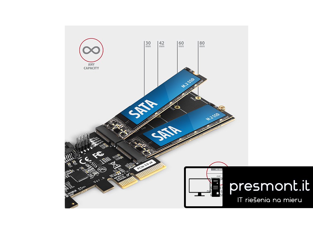 PCI-Express řadič AXAGON PCES-SA4M2 rozšíří stolní PC o dva SATA III porty a dva sloty pro SATA M.2 disky s přenosovou rychlostí až 6Gb/s. Kombinace dvouportového SATA III řadiče a dvou SATA M.2 slotů dělá z karty velice užitečné zařízení pro rozšíření vašeho počítače. Snadno tak připojíte až čtyři disky např. dva 3.5“ disky nebo optické mechaniky a dva SATA M.2 disky. Karta osazená čipsetem ASMedia nabízí nejen podporu specifikace SATA 3.0, ale i dalších SATA technologií jako Hot-Plug, Native Command Queue (NCQ), TRIM nebo Port Multiplier. Jednoduchá instalace bez nutnosti instalace ovladačů ve většině operačních systémů. Díky přibalené low profile záslepce lze řadič osadit jak do standardní, tak i do nízkoprofilové PC skříně. Vstup: • Rozhraní PCI-Express 3.0, kompatibilní s PCI-Express 1.0a / 1.1 / 2.0 /2.1. • Počet linek 2-Lane (x2), kompatibilní s x4 / x8 / x16 PCIe sloty. • Propustnost 2-Lane PCI-Express 3.0 sběrnice 4 GB/s obousměrně. Výstupy: • 2x nezávislý Serial ATA port, standard SATA III 6G. • 2x interní 7-pin SATA datový konektor. • Podpora všech SATA I / SATA II / SATA III optických mechanik, SSD a pevných disků všech kapacit. • 2x nezávislý NGFF 75-pinový B-key slot pro SATA M.2 disky. • Určeno pro disky formátu B+M-key a B-key o rozměru 2230, 2242, 2260 a 2280 mm. • Podpora jednostranných i oboustranných SATA M.2 SSD disků všech kapacit. Další vlastnosti: • Plná podpora Plug and Play. • Vyhovuje Serial ATA 3.0 specifikaci (SATA/600), přenosové rychlosti až 6 Gb/s (600 MB/s). • Vyhovuje Serial ATA 2.0 specifikaci (SATA/300), přenosové rychlosti až 3 Gb/s (300 MB/s). • Vyhovuje Serial ATA 1.0 specifikaci (SATA/150), přenosové rychlosti až 1.5 Gb/s (150 MB/s). • Vyhovuje Serial ATA AHCI (Advanced Host Controller Interface) specifikaci revize 1.4. • Podpora Hot Plug umožňující připojení a odpojení SATA zařízení za chodu. • Podpora Native Command Queuing (NCQ). • Podpora funkce TRIM pro SSD disky. • Podpora funkce Port Multiplier Command Based Switching. • Podpora bootování z připojeného disku vč. spolupráce s BIOS/UEFI základní desky počítače. • 4x LED pro indikaci aktivity připojených disků. • Čtyři 2-pinové patice pro připojení HDD LED kontrolek skříně. • Použit čipset ASMedia ASM1164. Podporované operační systémy: • MS Windows 7 / 8 / 8.1 / 10 / 11 a novější, Windows Server 2008 / 2012 / 2016 / 2019 / 2022 a novější (podporovány všechny 32- i 64-bitové verze OS Windows), Linux s jádrem 2.6.x a vyšším. Balení v kartónové krabičce obsahuje: • PCI-Express řadič se standardní záslepkou, • low profile záslepku, • montážní materiál, • vícejazyčný návod CZ/DE/DK/ENG/ESP/FIN/FR/GR/HR/HU/IT/NL/PL/PT/RO/RU/SK/SWE/BG/CN/TR/ARA.Dodatočné parametre