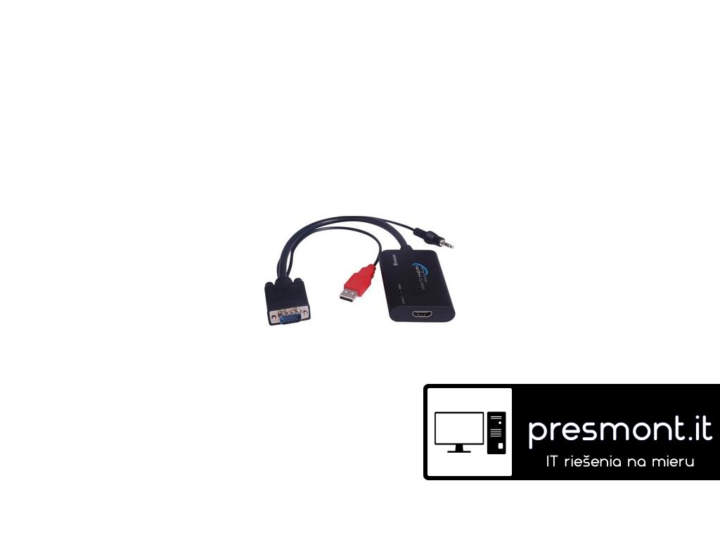 PremiumCord VGA+audio elektronický konvertor na rozhraní HDMI - Převádí signál VGA na digitální rozhraní HDMI pro LCD nebo TV - HDCP kompatibilní - Jednoduchá instalace a montáž, prostým zapojením do vypnutého počítače a monitoru. - Podporuje rozlišení FULL HD 1080p (1920*1080) - Podporuje rozlišení:640*480,800*600,1024*768,1280*768,1280*1024 až 1920x1080 FULL HD - Převádí analogové audio do HDMI konektoru. - Vstupy: VGA DB15HD male, AUDIO stereo jack 3,5mm male. - Výstup: HDMI female - Napájení je z USB portu, k tomuto účelu slouží červený USB konektor - Podporuje: Windows 98/98SE/ME/2000/XP/Vista/2003/Windows 7/8/10,Mac - Délka kabelu je 25cm, celková délka vč. převodníku 35cmDodatočné parametre