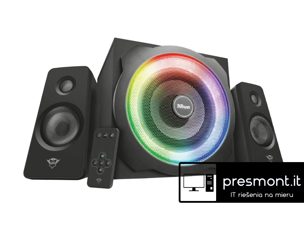 -120W špičkový výkon (60 W RMS) -Pro PC, notebook, televizi, smartphone a tablet -Dřevěný subwoofer pro bohatý a výkonný zvuk -Přednastavené světelné režimy: 7 barev synchronizovaných na basu, RGB dýchání, rotační RGB, synchronizované RGB -Včetně bezdrátového dálkového ovladače pro ovládání napájení, hlasitosti, basů a světel -Inteligentní řízení spotřeby: při nepoužívání se přepne do pohotovostního režimu -Typ zapojení: 3,5mm -Výstup: 120W -Výstup (RMS): 60W -Frekvenční rozsah: 20 - 20000 Hz -Impedance: 4 Ohm -Hmotnost: 4240g -Odpojitelný napájecí kabel -Dálkové ovládání Odkaz na stránky výrobce https://www.trust.com/en/product/22944-gxt-629-tytan-2-1-rgb-speaker-setDodatočné parametre