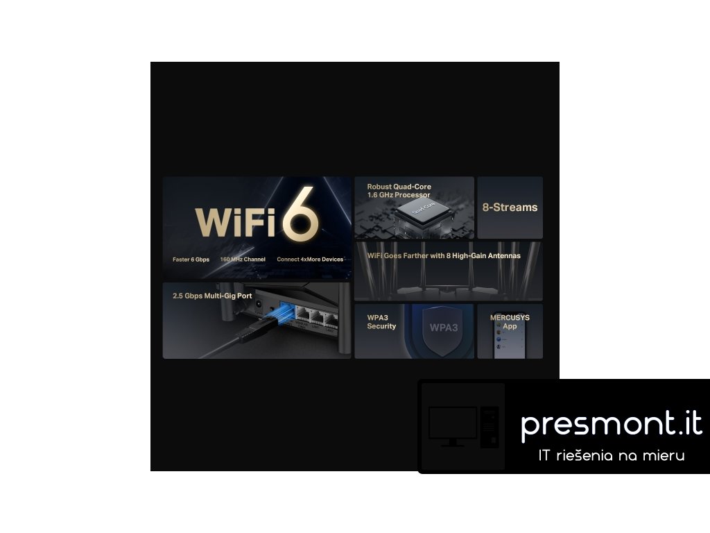 MR90X MR90X AX6000 Dual-Band Wi-Fi 6 RouterSPEED: 1148 Mbps at 2.4 GHz + 4804 Mbps at 5 GHz SPEC: 8× Fixed External Antennas, 1× 2.5 Gbps Port (WAN/LAN auto-sensing), 1× Gigabit Port (WAN/LAN auto-sensing), 2× Gigabit LAN Ports, 1024-QAM, OFDMA, HE160FEATURE: MERCUSYS APP, Router/Access Point Mode, WPS/Reset Button, IPTV, IPv6, Smart Connect, Beamforming, MU-MIMO, Parental Controls, Guest Network, Qos, VPN Server, DFS, WPA3, BSS Color, TWT, TR-069, ISP Preset (Agile Config), Aginet ACS, Superadmin, EasyMesh KLÍČOVÉ VLASTNOSTIDodatočné parametre