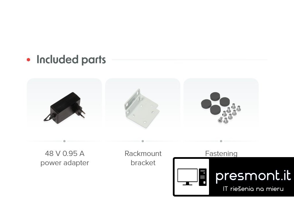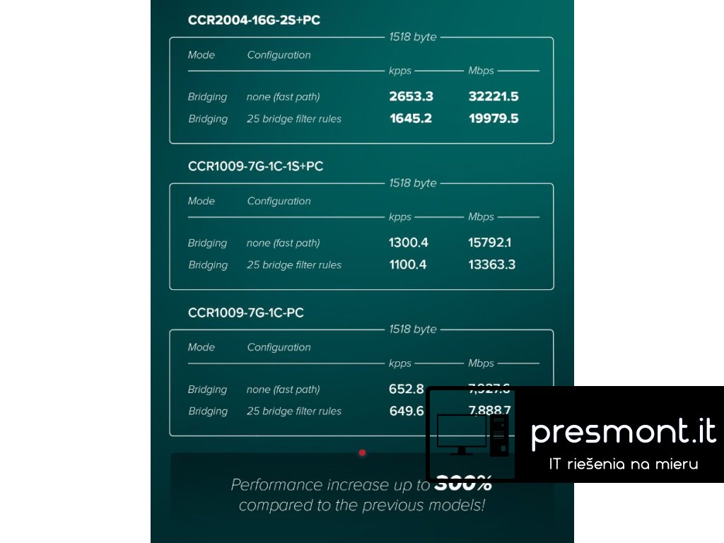 Popis produktu CCR2004-16G-2S+PC je desktopový nebo rackmount router do 19'' racku z nové řady CCR routerů, která přichází s pasivním chlazením a nejvyšším poměrovým výkonem na 1 jádro ze všech CCR, což je nejdůležitější aspekt, pokud jde o náročnější operace založené na processing per-connection (např. QoS). Router je poháněn CPU s 64bit ARM architekturou s taktem 1200 MHz, má 4GB RAM typu DDR4 a 128MB NAND uložiště. Router disponuje 16× Gigabit LAN, 2× SFP+ slot (možnost zapojit 1G i 10G moduly) a sériovým portem typu RJ45. Na zadní straně má dostatečně nadimenzovaný pasivní chladič a dva DC vstupy se vstupním napětím 36 až 57 V DC - svorkovnice a konektor. Klíčové vlastnosti Výkonné desktop/rackmount zařízení s ARM 64bit architekturou CPU 1200 MHz, 4 jádra, 4GB RAM, 128MB NAND Dva DC vstupy - konektor a svorkovnice Pasivní chlazení Rozhraní: (16) Gigabit, (2) SFP/SFP+ Předinstalován RouterOS L6 Obsah balení Zařízení Uši do 19'' racku Napájecí adaptér 48 V / 0.95 A Technické parametry Konektory a rozhraní Možnost více WAN:Ano Rychlost LAN:(16) 10/100/1000Mbps Gigabit LAN:Ano Optické rozhraní:(2) 1G/10Gbps Sériový port:RJ45 Napájení Typ napájení:DC konektor, DC svorkovnice Max. spotřeba energie [W]:30 Napájení přes konektor/svorkovnici:36 .. 57V DC Fyzické charakteristiky Provedení:Desktop, Rackmount Počet ''U'' pozic:1 Ventilátory:Bez ventilátoru Tlačítka:Reset Provozní teplota [°C]:-20 až 60 Šířka [mm]:272 Výška [mm]:44 Hloubka [mm]:195 Hardware CPU:AL32400 Frekvence CPU [MHz]:1200 Počet CPU jader:4 Interní uložiště [MB]:128 RAM [MB]:4096 Software Operační systém:RouterOS - L6 Podpora IPv6:Ano Výchozí IP adresa:192.168.88.1 Výchozí jméno a heslo:admin / -Dodatočné parametre