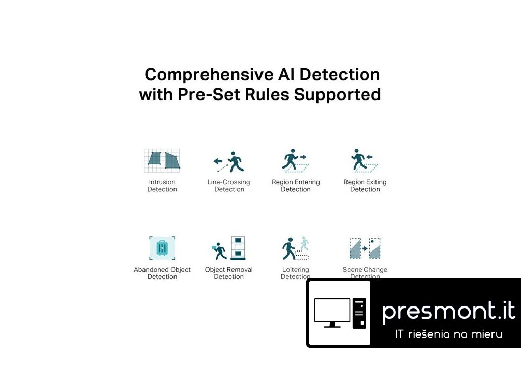 Smart Event Human & Vehicle Classification, Area Intrusion Detection, Line-Crossing Detection, People Detection, Vehicle Detection, Region Entering Detection, Region Exiting Detection, Object Abandoned Detection, Object Removal Detection, Loitering Detection, Scene Change Detection