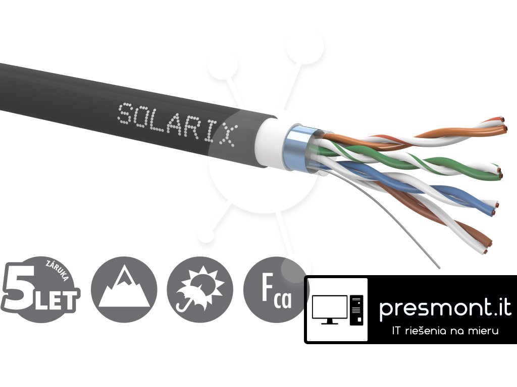 Instalační kabel Solarix s označením SXKD-5E-FTP-PVC+PE je spolehlivý stíněný kabel kategorie 5E s dvojitým pláštěm, který je určený pro provoz ethernetových protokolů, včetně 2.5GBASE-T a 5GBASE-T*. Konstrukce kabelu je F/UTP, typ pláště je PVC (vnitřní plášť) a UV stabilní PE (vnější plášť) s třídou reakce na oheň Fca. Vodiče kabelu jsou vyrobeny z kvalitního měděného drátu s čistotou mědi 99,97 %. Kabel bez problémů splňuje požadavky z mezinárodních standardů ISO/IEC 11801, EN 50173 a ANSI/TIA 568.2-D. Kabel je určen pro náročnější instalace, kde dvojitý PVC+PE plášť s celkovou tloušťkou 1,1 mm, poskytuje vysokou ochranu proti vlivům okolního prostředí. Stejně jako ostatní kabely Solarix, je i kabel SXKD-5E-FTP-PVC+PE značen metráží po 1 m v rozsahu od 0 do 305 m. Kabel je dodáván na vysoce pevné dřevěné cívce, na které jsou uvedeny všechny nezbytné produktové informace, včetně čárových kódů, výrobní šarže, popisu a nejdůležitějších technických parametrů. Tento kabel není určen pro trvalé uložení do vody ani do země bez odpovídající řádné ochrany. Technické parametry Kategorie: CAT5E Podporované protokoly: 2.5/5GBASE-T a nižší Stínění: fólie kolem všech 4 párů Šířka pásma: 100 MHz Typ a velikost vodiče: měděný drát 0,50 mm ± 0,005 mm Izolace a průměr vodiče s izolací: HDPE 1,0 mm Třída reakce na oheň, typ pláště: Fca, PVC+PE Barva pláště: šedá RAL 7035 (vnitřní plášť), černá RAL 9005 (vnější plášť) Průměr kabelu: 7,4 mm Váha: 53,1 kg/km NVP: 68 % Propagation delay: 535 ns/100 m Delay skew: 20 ns/100 m Skladovací teplota: -20 °C až 70 °C Provozní teplota: -20 °C až 70 °C Teplota při instalaci: 0 °C až 50 °C Balení: 305 m, dřevěná cívka Rozměry balení (průměr x výška): 380 mm x 240 mm Počet balení na paletě: 45 cívek (velká paleta), 36 cívek (malá paleta)Dodatočné parametre