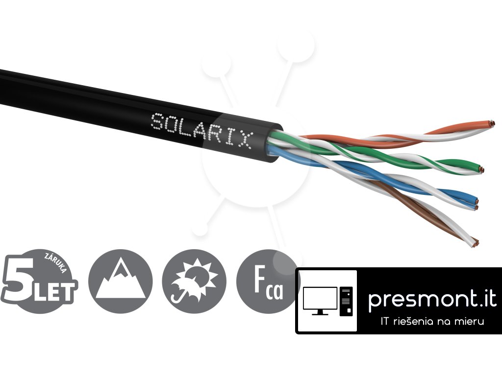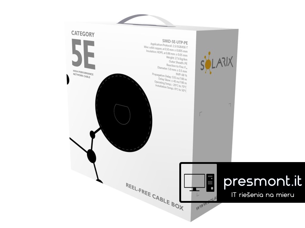 Instalační kabel Solarix s označením SXKD-5E-UTP-PE je spolehlivý venkovní nestíněný kabel kategorie 5E, který je určený pro provoz ethernetových protokolů, včetně 2.5GBASE-T a 5GBASE-T*. Konstrukce kabelu je U/UTP, typ pláště UV stabilní PE s třídou reakce na oheň Fca a stupněm krytí IP67. Vodiče kabelu jsou vyrobeny z kvalitního měděného drátu s čistotou mědi 99,97 %. Kabel bez problémů splňuje požadavky z mezinárodních standardů ISO/IEC 11801, EN 50173 a ANSI/TIA 568.2-D. Stejně jako ostatní kabely Solarix, je i kabel SXKD-5E-UTP-PE značen metráží po 1 m v rozsahu od 0 do 100 m. Kabel je dodáván ve vysoce odolném třívrstvém leštěném kartónovém boxu (vždy barevně odlišeném podle typu kabelu), na kterém jsou uvedeny všechny nezbytné produktové informace, včetně čárových kódů, výrobní šarže, popisu a nejdůležitějších technických parametrů. Tento kabel není určen pro trvalé uložení do vody ani do země bez odpovídající řádné ochrany. Technické parametry Kategorie: CAT5E Podporované protokoly: 2.5/5GBASE-T a nižší Stínění: ne Šířka pásma: 100 MHz Typ a velikost vodiče: měděný drát 0,50 mm ± 0,005 mm Izolace a průměr vodiče s izolací: HDPE 0,88 mm Třída reakce na oheň, typ pláště: Fca, PE Barva pláště: černá RAL 9005 Průměr kabelu: 5,0 mm Váha: 27,6 kg/km NVP: 68 % Propagation delay: 535 ns/100 m Delay skew: nižší než 45 ns/100 m Skladovací teplota: -20 °C až 70 °C Provozní teplota: -20 °C až 70 °C Teplota při instalaci: 0 °C až 50 °C Balení: 100 m, třívrstvý kartónový box Rozměry balení (výška x hloubka x šířka): 260 mm x 260 mm x 120 mm Počet balení na paletě: 128 boxůDodatočné parametre