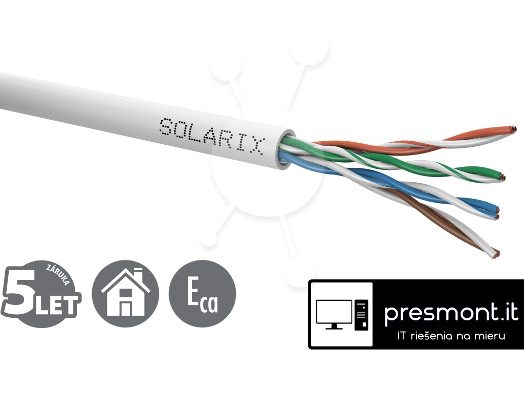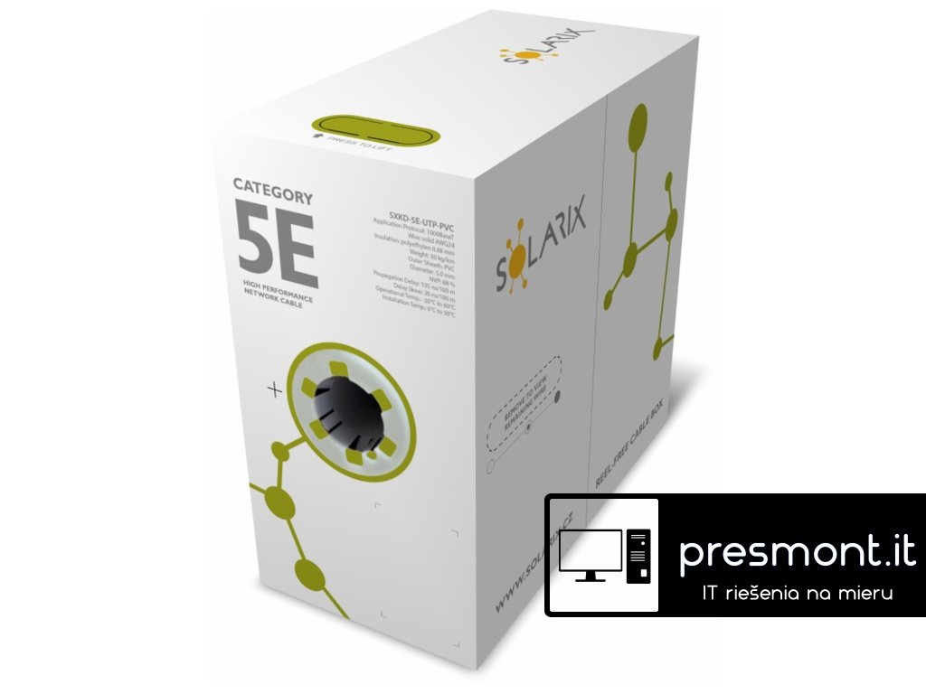 Instalační kabel Solarix s označením SXKD-5E-UTP-PVC je spolehlivý nestíněný kabel kategorie 5E, který je určený pro provoz ethernetových protokolů, včetně 2.5GBASE-T a 5GBASE-T*. Konstrukce kabelu je U/UTP, typ pláště PVC s třídou reakce na oheň Eca. Vodiče kabelu jsou vyrobeny z kvalitního měděného drátu s čistotou mědi 99,97 %. Kabel bez problémů splňuje požadavky z mezinárodních standardů ISO/IEC 11801, EN 50173 a ANSI/TIA 568.2-D. V případě CPR (nařízení EU č. 305/2011) je kabel testován u nezávislé laboratoře FORCE TECHNOLOGY v systému posuzování vlastností AVCP 3. Stejně jako ostatní kabely Solarix, je i kabel SXKD-5E-UTP-PVC značen metráží po 1 m v rozsahu od 0 do 500 m. Kabel je dodáván ve vysoce odolném třívrstvém leštěném kartónovém boxu (vždy barevně odlišeném podle typu kabelu), na kterém jsou uvedeny všechny nezbytné produktové informace, včetně čárových kódů, výrobní šarže, popisu a nejdůležitějších technických parametrů. Technické parametry Kategorie: CAT5E Podporované protokoly: 2.5/5GBASE-T a nižší Stínění: ne Šířka pásma: 100 MHz Typ a velikost vodiče: měděný drát 0,50 mm ± 0,005 mm Izolace a průměr vodiče s izolací: HDPE 0,88 mm Třída reakce na oheň, typ pláště: Eca, PVC Barva pláště: šedá RAL 7035 Průměr kabelu: 5,0 mm Váha: 29,2 kg/km NVP: 68 % Propagation delay: 535 ns/100 m Delay skew: nižší než 45 ns/100 m Skladovací teplota: -20 °C až 60 °C Provozní teplota: -20 °C až 60 °C Teplota při instalaci: 0 °C až 50 °C Balení: 500 m, třívrstvý kartónový box Rozměry balení (výška x hloubka x šířka): 420 mm x 420 mm x 215 mm Počet balení na paletě: 30 boxů (velká paleta), 24 boxů (malá paleta)Dodatočné parametre