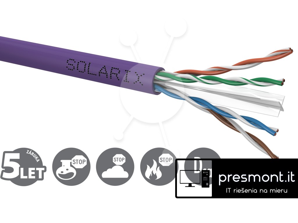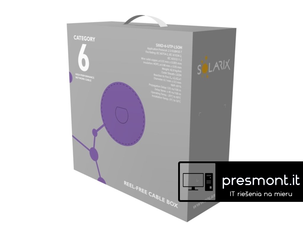 POZOR, nový 100 m box. Instalační kabel Solarix s označením SXKD-6-UTP-LSOH je spolehlivý nestíněný kabel kategorie 6, který je testován až do šířky pásma 450 MHz, a je určený pro provoz ethernetových protokolů, včetně 2.5GBASE-T a 5GBASE-T. Konstrukce kabelu je U/UTP s plastovým křížem, který zajišťuje maximální oddělení párů od sebe po celé délce kabelu. Typ pláště je LSOH s třídou reakce na oheň Dca-s2,d2,a1. Vodiče kabelu jsou vyrobeny z kvalitního měděného drátu s čistotou mědi 99,97 %. Kabel bez problémů splňuje požadavky z mezinárodních standardů ISO/IEC 11801, EN 50173 a ANSI/TIA 568.2-D. Výkonové parametry tohoto kabelu byly otestovány nezávislou testovací zkušebnou FORCE TECHNOLOGY v rámci programu EC Verified, a to na nejvyšší úroveň tzv. Component Level. Certifikát je k dispozici zde na webu v záložce ''Odkazy'' nebo přímo na stránkách laboratoře FORCE. V případě CPR (nařízení EU č. 305/2011) je kabel testován v systému posuzování vlastností AVCP 3. Stejně jako ostatní kabely Solarix, je i kabel SXKD-6-UTP-LSOH značen metráží po 1 m v rozsahu od 0 do 100 m. Kabel je dodáván ve vysoce odolném třívrstvém leštěném kartónovém boxu, na kterém jsou uvedeny všechny nezbytné produktové informace, včetně čárových kódů, výrobní šarže, popisu a nejdůležitějších technických parametrů. Technické parametry Kategorie: CAT6 Podporované protokoly: 2.5/5GBASE-T a nižší Stínění: ne Šířka pásma: testováno do 450 MHz Typ a velikost vodiče: měděný drát 0,55 mm ± 0,005 mm Izolace a průměr vodiče s izolací: HDPE 0,98 mm Třída reakce na oheň, typ pláště: Dca-s2,d2,a1, LSOH Barva pláště: fialová RAL 4005 Průměr kabelu: 6,1 mm Váha: 42,8 kg/km NVP: 69 % Propagation delay: 535 ns/100 m Delay skew: nižší než 45 ns/100 m Skladovací teplota: -20 °C až 60 °C Provozní teplota: -20 °C až 60 °C Teplota při instalaci: 0 °C až 50 °C Balení: 100 m, třívrstvý kartónový box Rozměry balení (výška x hloubka x šířka): 315 mm x 315 mm x 120 mm Počet balení na paletě: 72 boxůDodatočné parametre