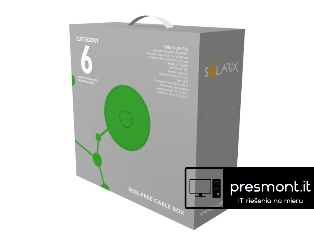 POZOR, nový 100 m box. Instalační kabel Solarix s označením SXKD-6-UTP-PVC je spolehlivý nestíněný kabel kategorie 6, který je určený pro provoz ethernetových protokolů, včetně 2.5GBASE-T a 5GBASE-T. Konstrukce kabelu je U/UTP s plastovým křížem, který zajišťuje maximální oddělení párů od sebe po celé délce kabelu. Typ pláště je PVC s třídou reakce na oheň Eca. Vodiče kabelu jsou vyrobeny z kvalitního měděného drátu s čistotou mědi 99,97 %. Kabel bez problémů splňuje požadavky z mezinárodních standardů ISO/IEC 11801, EN 50173 a ANSI/TIA 568.2-D. V případě CPR (nařízení EU č. 305/2011) je kabel testován u nezávislé laboratoře FORCE TECHNOLOGY v systému posuzování vlastností AVCP 3. Stejně jako ostatní kabely Solarix, je i kabel SXKD-6-UTP-PVC značen metráží po 1 m v rozsahu od 0 do 100 m. Kabel je dodáván ve vysoce odolném třívrstvém leštěném kartónovém boxu, na kterém jsou uvedeny všechny nezbytné produktové informace, včetně čárových kódů, výrobní šarže, popisu a nejdůležitějších technických parametrů. Technické parametry Kategorie: CAT6 Podporované protokoly: 2.5/5GBASE-T a nižší Stínění: ne Šířka pásma: 250 MHz Typ a velikost vodiče: měděný drát 0,55 mm ± 0,005 mm Izolace a průměr vodiče s izolací: HDPE 0,98 mm Třída reakce na oheň, typ pláště: Eca, PVC Barva pláště: šedá RAL 7035 Průměr kabelu: 6,1 mm Váha: 41,7 kg/km NVP: 69 % Propagation delay: 535 ns/100 m Delay skew: nižší než 45 ns/100 m Skladovací teplota: -20 °C až 60 °C Provozní teplota: -20 °C až 60 °C Teplota při instalaci: 0 °C až 50 °C Balení: 100 m, třívrstvý kartónový box Rozměry balení (výška x hloubka x šířka): 315 mm x 315 mm x 120 mm Počet balení na paletě: 72 boxůDodatočné parametre