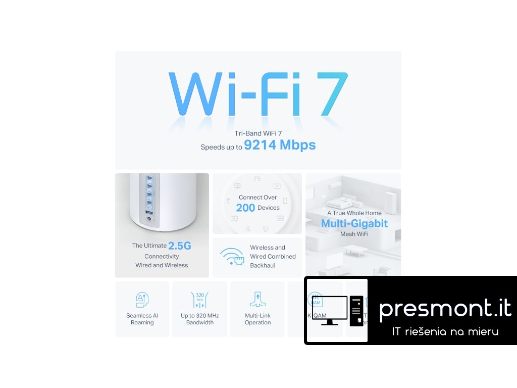 Bezdrátové Standardy – Wi-Fi 7 *IEEE 802.11be/ax 6 GHz *IEEE 802.11be/ax/ac/n/a 5 GHz *IEEE 802.11ax/n/b/g 2,4 GHz Rychlosti WiFi - BE9300 *6 GHz: 5760 Mbps (802.11be) *5 GHz: 2880 Mbps (802.11be) *2,4 GHz: 574 Mbps (802.11ax) Funkce WiFi *Třípásmový *2x2 MU-MIMO *OFDMA Pracovní režimy * Režim routeru * Režim přístupového bodu Pokročilé funkce * Provoz s více linkami (MLO) *320 MHz kanál *4K-QAM *Více RU *Funguje s Alexou a Google Assistant * Síť IoTZabezpečení Šifrování WiFi *WPA-Osobní *WPA2-Osobní *WPA3-Osobní Zabezpečení sítě *SPI Firewall * Řízení přístupu Zabezpečení HomeShield * Ochrana IoT v reálném čase *Malicious Site Blocker * Systém prevence narušení *Prevence DDoS útoků *Skener domácí sítě Síť pro hosty *1× 6 GHz hostující síť *1× 5 GHz hostující síť *1× 2,4 GHz hostující síť Server VPN *OpenVPN Server *PPTP VPN server *L2TP VPN server VPN klient * Klient OpenVPN *PPTP VPN klient * Klient L2TP VPN