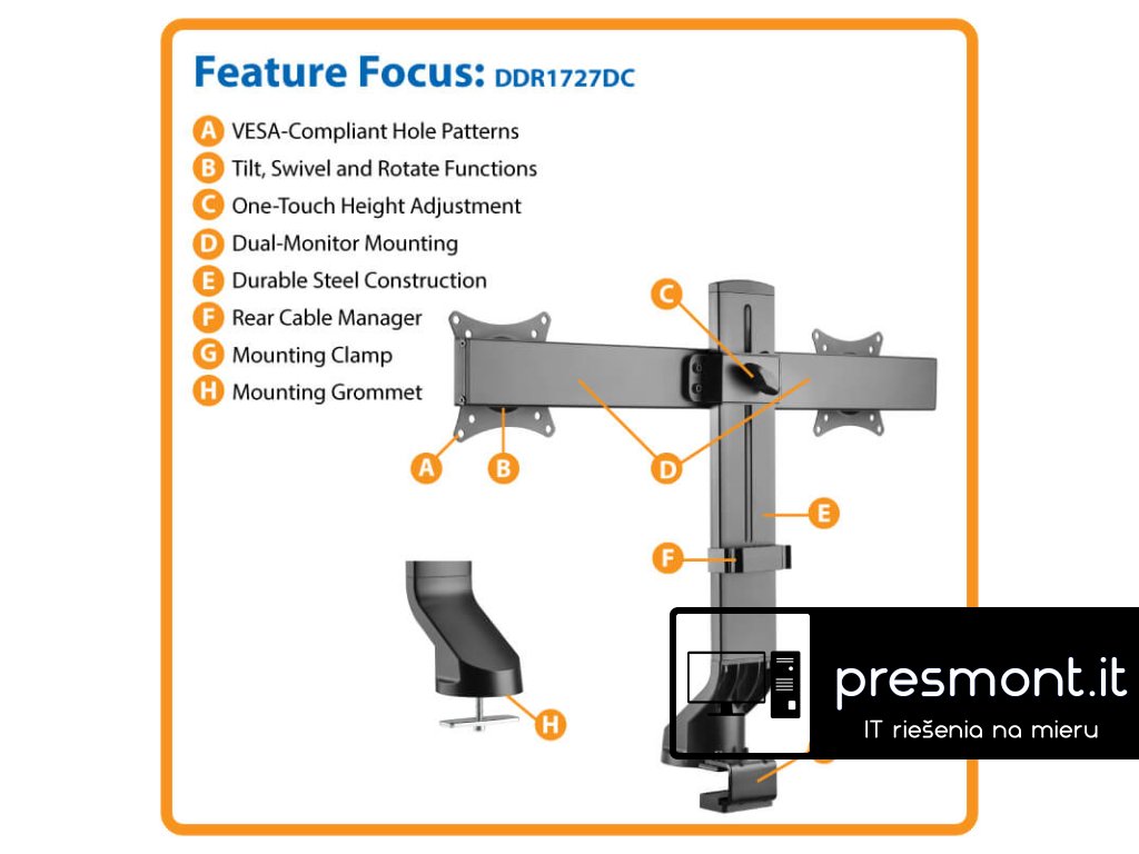 Rameno monitoru se dvěma displeji se svorkou na stůl a průchodkou – výškově nastavitelné, monitory 17” až 27” *Připevňuje 2 monitory k vašemu pracovnímu prostoru pomocí svorky nebo průchodky a umožňuje vertikální nastavení jedním dotykem pomocí snadno uchopitelného knoflíku *Nízkoprofilové rameno monitoru se připevňuje k vašemu stolu pomocí svorky nebo průchodky - 0,4 až 1'' pro svorku a 0,4 až 1,6'' pro průchodku *Nastavení jedním dotykem vám umožní sledovat 2 monitory v pohodlné výšce *Nabízí -10° až +10° náklon, 10° otočení a 180° rotaci, které vám pomohou najít perfektní úhel *Odolná ocelová konstrukce splyne s jakýmkoliv dekorem a unese až 15,4 lb (6,9 kg) na obrazovku *Kabely displeje se připojují k tenkému držáku, aby se snížil nepořádek a kabely byly uspořádanéDodatočné parametre