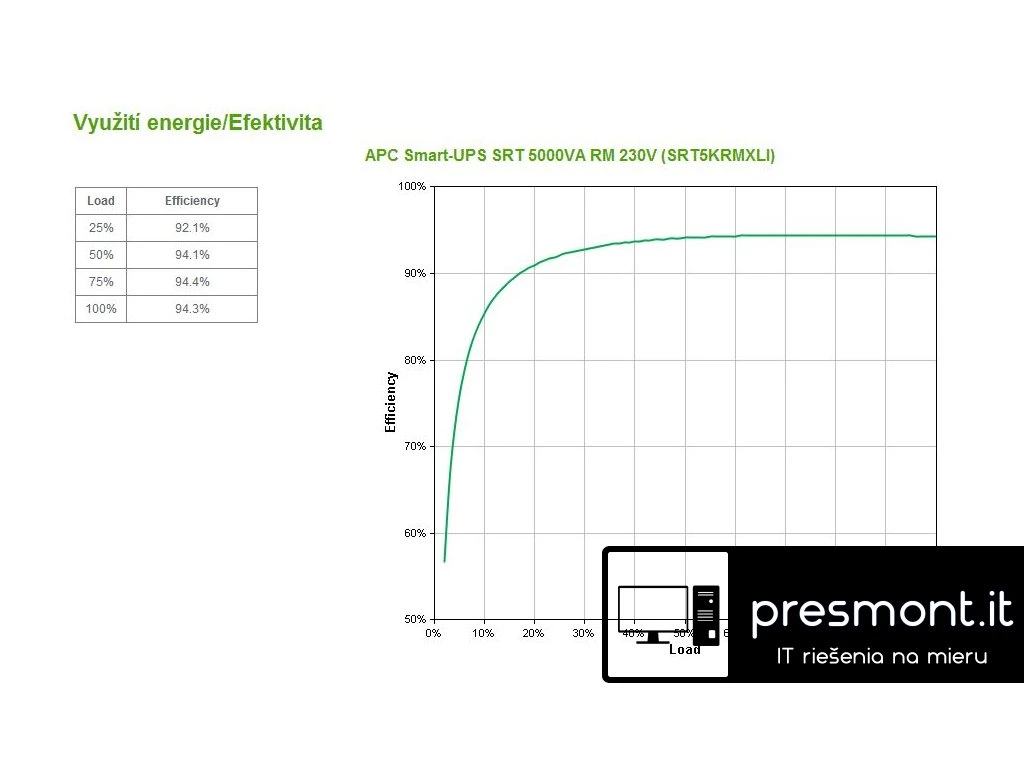 APC Smart-UPS SRT 5000VA RM 230V Ochrana napájení online s vysokou hustotou, dvojitou konverzí a možností škálování za provozu VÝSTUP Kapacita výstupního výkonu [W]: 4500 Kapacita výstupního výkonu [VA]: 5000 Jmenovité výstupní napětí [V]: 230 Topologie: Online s dvojí konverzí Typ křivky: Sinusoida Výstupní přípojky: (6) IEC 320 C13 (Záložní provoz na baterie) (4) IEC 320 C19 (Záložní provoz na baterie) (2) IEC Jumpers (Záložní provoz na baterie) VSTUP Jmenovité vstupní napětí [V]: 230 Typ připojení vstupu: Hard Wire 3 wire (1PH+N+G) Kmitočet na vstupu [Hz]: 40 - 70 Hz (automatické nastavení citlivosti Rozsah vstupního napětí pro napájení z rozvodné sítě [V]: 160-275 BATERIE A DOBA BĚHU Typ baterie: Bezúdržbový olověný zatavený akumulátor se suspendovaným elektrolytem: neteče Obvyklá doba nabíjení [Hod]: 1,5 Očekávaná životnost baterie: 3-5 Počet bateriových modulů: 1 KOMUNIKACE A SPRÁVA Port rozhraní: RJ-45 10/100 Base-T, RJ-45 Serial, Smart-Slot, USB Ovládací panel: Multifunkční LCD stavová a kontrolní konzola Zvukové upozornění: Akustická a vizuální varování seřazená podle závažnosti události Nouzové vypínání (EPO): Ano Množství rozhraní šachet SmartSlot™: 1 FYZICKÉ Maximální výška [cm]: 13 Maximální šířka [cm]: 43,2 Maximální hloubka [cm]: 71,94 Čistá hmotnost [kg]: 54,43 Barva: černá Provozní teplota [°C]: 0-40 Zahrnuje: Disk CD s dokumentací, Instalační příručka, Skříňové instalační konzole, Hardware pro montáž do stojanu, Skříňové podpěrné lišty, Teplotní čidlo, Záruční karta, Karta pro řízení přes web/SNMP Záruka: 36 Odkaz na web výrobce: https://www.se.com/cz/cs/product/SRT5KRMXLI/apc-smartups-online-5kva-5kw-mont%C3%A1%C5%BE-do-stojanu-3u-230v-6x-iec-c13-4x-iec-c19-smartslot-mngmt-karta-railkit/Dodatočné parametre