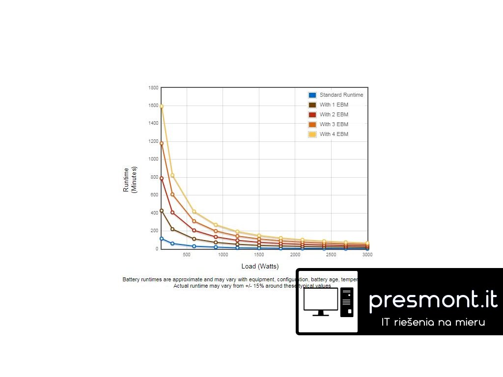 Eaton 9PX 3000W RT2U (samostatně stojící/rack 2U) se síťovou kartou Záložní doba 100% zátěž (min): 3 Záložní doba 50% zátěž (min): 9,5 VÝSTUP Kapacita výstupního výkonu [W]: 3 000 Kapacita výstupního výkonu [VA]: 3 000 Jmenovité výstupní napětí [V]: 200/208/220/230/240 V Topologie: Dvojitá konverze v reálném čase se systémem korekce účiníku (Power Factor Correction – PFC) Výstupní přípojky: -(8) IEC-320-C13 -(2) IEC-320-C19 Účinnost [%]: Až 94 % v online režimu (až 98 % v režimu vysoké účinnosti) VSTUP Jmenovité vstupní napětí [V]: 200/208/220/230/240 V Typ připojení vstupu: IEC-320-C20 Kmitočet na vstupu [Hz]: 40-70 KOMUNIKACE A SPRÁVA Port rozhraní: Síťová karta + 1 USB port + 1 sériový port RS232 + 1 svorkovnice pro dálkové zapínání/vypínání + 1 svorkovnice pro vzdálené vypínání + 1 svorkovnice pro výstupné relé Ovládací panel: Vícejazyčný grafický LCD displej FYZICKÉ Maximální výška [cm]: 8,65 Maximální šířka [cm]: 44 Maximální hloubka [cm]: 60,5 Čistá hmotnost [kg]: 27,6 Barva: černá Provozní teplota [°C]: 0-40 Záruka: 24 měsíců Odkaz na web výrobce: http://powerquality.eaton.com/9PX3000IRTN.aspx?CX=54Dodatočné parametre