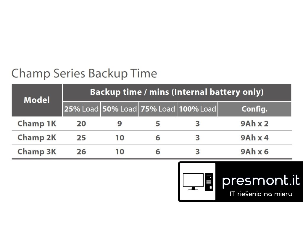 Řada Champ Tower Schuko je verze záložních zdrojů s vysokou hustotou dvoukonverzních online UPS s výkonovým faktorem 0.9. Je navržen v malém rozměru s mikroprocesorovým řadičem. Vhodné použití jako záložní zdroj ve firmách pro napájení serverů, s maximální hlučností 50dB na 1 metr. Má také standardní porty USB a RS-232 s vestavěným inteligentním slotem pro další adaptéry, převodníky protokolů a kartičky kontaktů. Hlavní vlastnosti: *řízení mikroprocesorem optimalizuje spolehlivost *korekce vstupního příkonu *výkonový faktor 0.9 *konverzní mód *režim ECO pro úsporu energie *funkce Smart SNMP funguje dobře s USB nebo RS-232 *LCD displej umožňuje snadné sledování a přístup k stavu UPS VÝSTUP Kapacita výstupního výkonu: 2700W Kapacita výstupního výkonu: 3000VA Topologie: Online s konverzí Typ křivky: čistá sinusoida Výstupní přípojky: 4x Schuko VSTUP Kmitočet na vstupu: 40Hz ~ 70Hz Rozsah vstupního napětí: 120-300V AC BATERIE A DOBA BĚHU Typ baterie: 12V/9Ah Předinstalovaná baterie: 6x Obvyklá doba nabíjení: 4 hodiny KOMUNIKACE A SPRÁVA Port rozhraní: USB, RS-232 Indikátory: LCD displej Zvukové upozornění: ano FYZICKÉ Maximální výška: 318 mm Maximální šířka: 190 mm Maximální hloubka: 421 mm Čistá hmotnost: 27,6 kg Barva: černá Provozní teplota: 0-40 °C Hlučnost: méně než 50 dB Obsah balení: UPS, napájecí kabel, USB kabel, software na CD, uživatelský manuál UPS selector: https://energy.fsp-europe.com/ -> Tools -> UPS Selector Odkaz na stránky výrobce: https://energy.fsp-europe.com/product/champ-tower-schuko-3k/ Video k Software ViewPower: https://www.youtube.com/watch?v=r3P4zmNBzjcDodatočné parametre