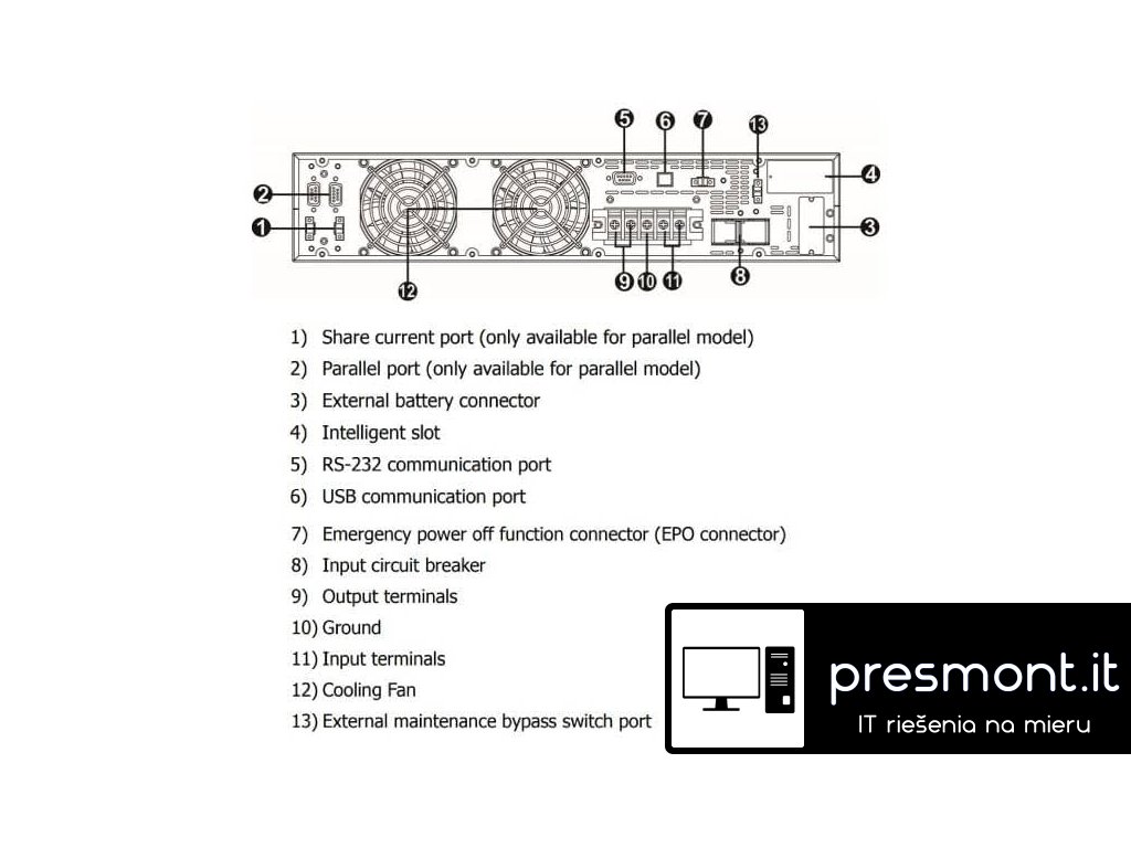 Jedná se o „Long run“ model, který neobsahuje baterie a je potřeba dokoupit příslušný počet battery bank. VÝSTUP Kapacita výstupního výkonu [W]: 10000 Kapacita výstupního výkonu [VA]: 10000 Výstupní napětí [V]: 208/220/230/240VAC Topologie: On-line Single Phase Typ křivky: Sine wave VSTUP Vstupní napětí [V]: 140~300V @ (60~80%) Load Kmitočet na vstupu [Hz]: 46Hz ~ 54 Hz @ 50Hz system 56Hz ~ 64 Hz @ 60Hz system Rozsah vstupního napětí [VAC]: 110~300Vac @ (0~60%) Load / 176~300Vac @(80~100%)Load BATERIE A DOBA BĚHU Typ baterie: bez baterie KOMUNIKACE A SPRÁVA Port rozhraní: USB, RS-232, EPO FYZICKÉ Maximální výška [cm]: 8,8 Maximální šířka [cm]: 43,8 Maximální hloubka [cm]: 60 Čistá hmotnost [kg]: 20 Barva: černá Provozní teplota [°C]: 0 ~ 40 Hlučnost [dB]: méně než 58 dB na 1 metr Věnujte zvýšenou pozornost správnému nastavení stálého a maximálního nabíjecího proudu dle manuálu, aby nedošlo k poškození baterií. Výchozí hodnota je nastavena na 4 A, avšak baterie instalované v připojovaném battery packu mohou podporovat nižší nabíjecí proud. Doporučené nastavení je 1 A nebo 2 A. UPS selector: https://energy.fsp-europe.com/ -> Tools -> UPS Selector Odkaz na stránky výrobce: https://energy.fsp-europe.com/product/clippers-10kl/ Video k Software ViewPower: https://www.youtube.com/watch?v=r3P4zmNBzjcDodatočné parametre
