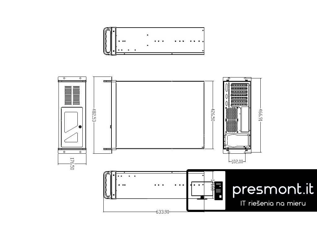 Přední panel /vše umístěné za zamykatelnými dvířky *ON/OFF vypínač *RESET tlačítko *HDD1 LED dioda *HDD2 LED dioda *POWER LED dioda *2 USB port Kompatibilita s MB *mATX, ATX, max. 305 x 330 mm Ventilace *přívod vzduchu - 1ks 120 x 120 v přední části *odvod vzduchu - příprava pro 2ks 80 x 80 mm v zadní části /pouze příprava, ventilátory nejsou součástí balení/ Počet a velikost pozic *externě dostupné 3 x 5.25'' + 1 x 3.5'' *interně dostupné 6 x 3.5'' Rozměry *case 178 x 427 x 585 mm (V x Š x H) *case včetně úchytů 178 x 488 x 635 mm (V x Š x H) *balení výrobku 245 x 537 x 705 mm (V x Š x H) | /0,09m3/ Napájecí zdroj *redundantní PSU nebo standardní ATX PSU (zdroj není součástí balení) Materiál *pochromovaná ocel (SECC - Steel, Electrically Chromate Coated) Síla materiálu *1.0 - 1.2 mm Váha *váha výrobku: 12 kg / váha výrobku v balení : 13kg Barva *šedáDodatočné parametre