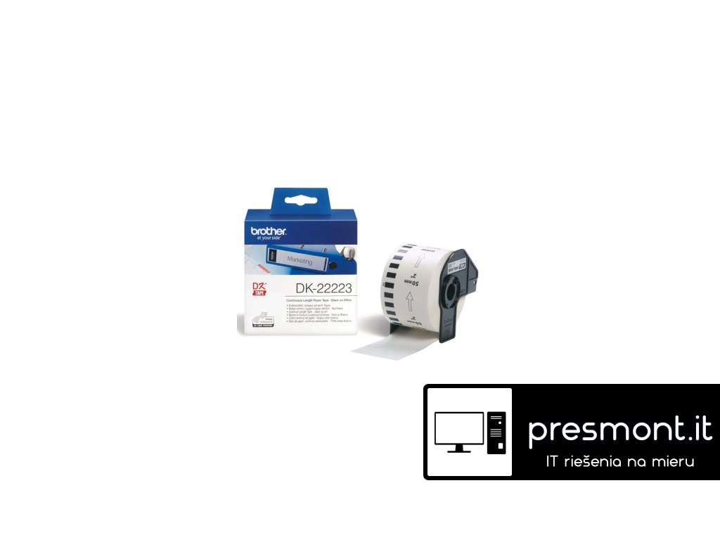 Originální Brother DK-22223 kontinuální papírová páska – černá na bílé, 50 mm šířka Ať už vyrábíte štítky na obálky, složky nebo regály, můžete si užít flexibilitu při vytváření jakéhokoli štítku. Páska DK-22223 je dodávána se silným lepidlem pro trvalou přilnavost, takže se hodí, jak na práci doma tak i ve firmě. Vlastnosti: *50 mm šířka, 30,48 m délka *Vysoce kvalitní originální štítky Brother *Jasné a trvanlivé výsledkyDodatočné parametre