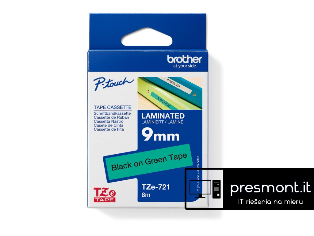 Originální kazeta s páskou Brother TZe-721 - černý tisk na zelené, šířka 9 mm Originální kazeta s laminovanou páskou TZe-721 kompatibilní s širokou řadou tiskáren Brother P-touch je zvláště všestranná díky své snadno čitelné černé a zelené barvě - ideální pro domácnost, kancelář a další pracoviště. Vlastnosti: *Šířka 9 mm, délka 8 m *Vysoce kvalitní originální kazeta Brother *Zajistí trvanlivé, jednoduše čitelné výtiskyDodatočné parametre
