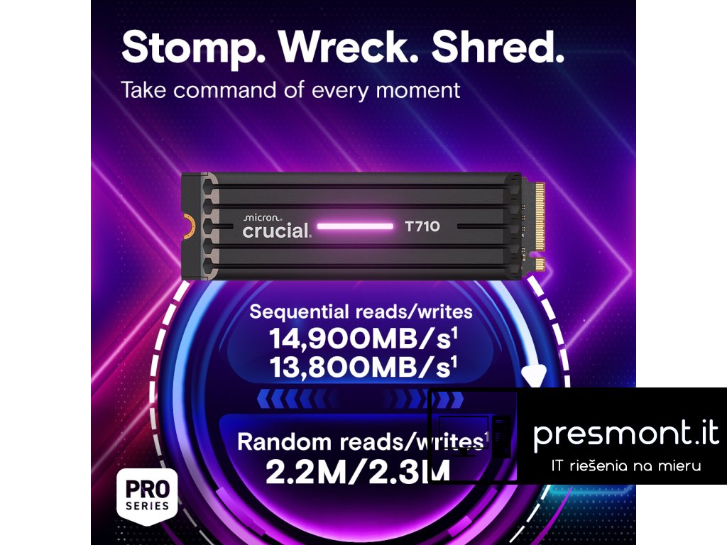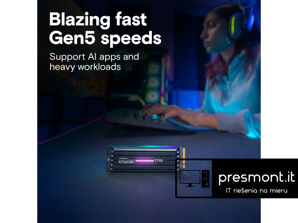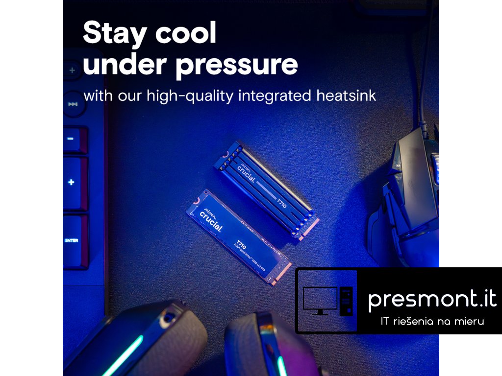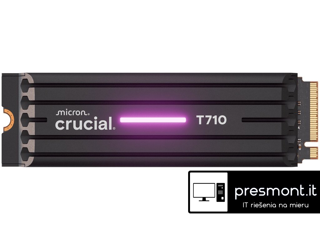 Crucial T710 4TB PCIe Gen5 NVMe 2280 M.2 SSD s chladičem * nekompromisní výkon 5. generace pro profesionální hráče a tvůrce T710 rozšiřuje váš herní a kreativní potenciál a poskytuje vám rychlý přístup k obrovským knihovnám a pohlcujícím zážitkům. SPECIFIKACE: Typ produktu: SSD Řada SSD: T710 Kapacita SSD: 4 TB Rozhraní: NVMe (PCIe 5. generace x4) Formát paměti-Form Factor: M.2 (2280) Chladič: ano - integrovaný Sekvenční zápis: 13800 MB/s Sekvenční čtení: 14500 MB/s Výdrž SSD disku (TBW): 2400 TB Množství v sadě: 1 Barva: černá Záruka: 5 letDodatočné parametre