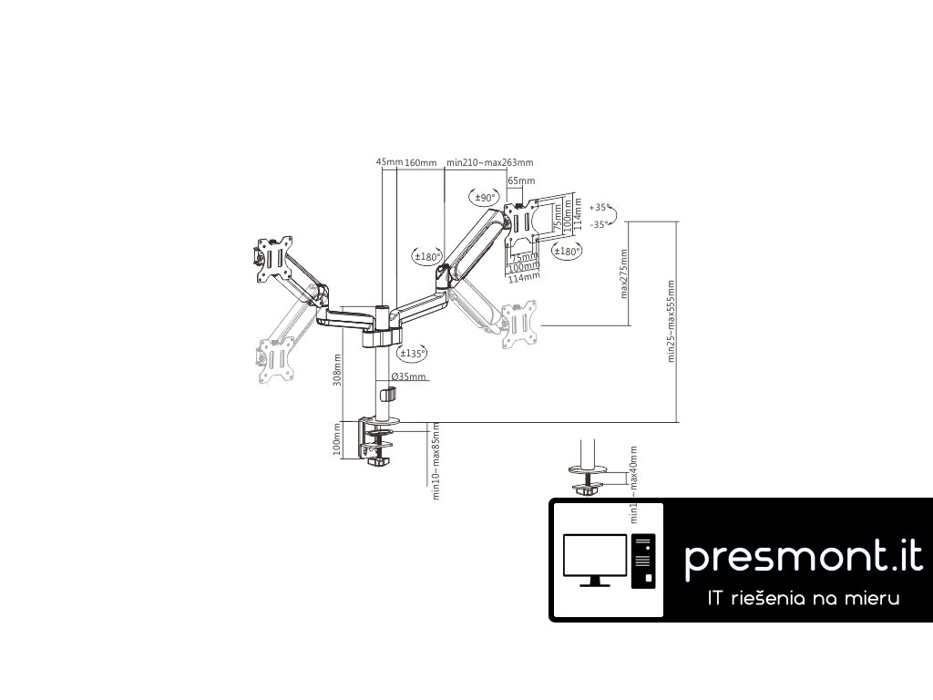 Držák monitoru Brateck LDT48-C024 je inovativní stolní držák, který byl navržen s ohledem na vaše potřeby a zlepšení pracovního prostoru. Tento všestranný držák s dvěma rameny a plynovou vzpěrou je ideální pro použití s různými typy monitorů, ať už pracujete z domova, v kanceláři nebo ve vzdělávacím prostředí. S držákem monitoru Brateck se vaše pracoviště stane efektivnějším a pohodlnějším. Díky odolné ocelové konstrukci poskytuje stabilní podporu pro dva monitory s úhlopříčkou 17'' až 32'' a hmotností až 9 kg. Flexibilní konstrukce pro dostatečné nastavení výšky a pozorovacích úhlů s možností nastavení orientace monitoru na výšku nebo na šířku. Součástí balení jsou průchodky a svorky pro instalaci na téměř jakoukoliv pracovní plochu. Odnímatelná deska VESA pro uživatelsky přívětivou instalaci. Součástí balení jsou kabelové spony pro usnadnění organizace vedení kabelů. HLAVNÍ VLASTNOSTI: • Flexibilní nastavení polohy: Držák umožňuje snadné nastavení výšky pomocí plynové vzpěry, nastavitelný náklon monitoru v úhlu +35° / -35°, otočení monitoru o 360°, nastavení úhlů ramene o 180°, takže můžete snadno najít optimální pozici pro pohodlné a ergonomické používání. Odnímatelná deska VESA umožňuje snadnou instalaci monitoru. • Univerzální kompatibilita: Tento stolní držák je kompatibilní s většinou monitorů o velikosti od 17'' do 32'' a s VESA standardy 75x75mm a 100x100mm. Nezáleží na tom, zda používáte LCD, LED nebo OLED monitor, držák monitoru Brateck poskytne bezpečné a stabilní uchycení. • Odolná konstrukce: Držák je vyroben z vysoce kvalitního ocelového a hliníkového materiálu, který zajišťuje stabilitu a odolnost. • Snadná instalace: Držák je dodáván s kompletním montážním příslušenstvím, díky němuž je možné ho snadno namontovat na stůl během několika minut. Montáž je možná pomocí svorky na desky o tloušťce 10-85 mm nebo pomocí průchodky na desky o tloušťce 10-40 mm. PŘEDNOSTI: • Zlepšuje ergonomii a pohodlí při práci s monitorem • Ušetří místo na vašem stole a pomůže udržovat věci organizované • Kompatibilní s širokou škálou monitorů a velikostí • Robustní a stabilní konstrukce pro dlouhodobé používání Užijte si optimální pracovní prostředí a zvyšte svoji produktivitu používáním držáků monitorů Brateck. Díky nastavitelnosti a univerzální kompatibilitě vám tento produkt nabídne skvělý zážitek při práci na vašem počítači. PARAMETRY: • Systém změny výšky monitoru: plynová vzpěra a posun na tyči • Maximální výška: 30,8 cm • Způsob montáže: svorka, průchodka • Dosah: 46,8 cm • Určení: pro monitory • Ramena - počet monitorů: 2 • Maximální náklon (nahoru, dolů): +35/-35° • Maximální vychýlení (vpravo, vlevo): 180° • Maximální otáčení obrazovky: 360° • Nosnost ramene: 9 kg • Max. úhlopříčka obrazovky: 32 palce • USB připojení: ne • Barva: černá mat • Rozměry (Š x V x H): 940mm x 715mm x 123mm • Hmotnost: 4.9 kgDodatočné parametre
