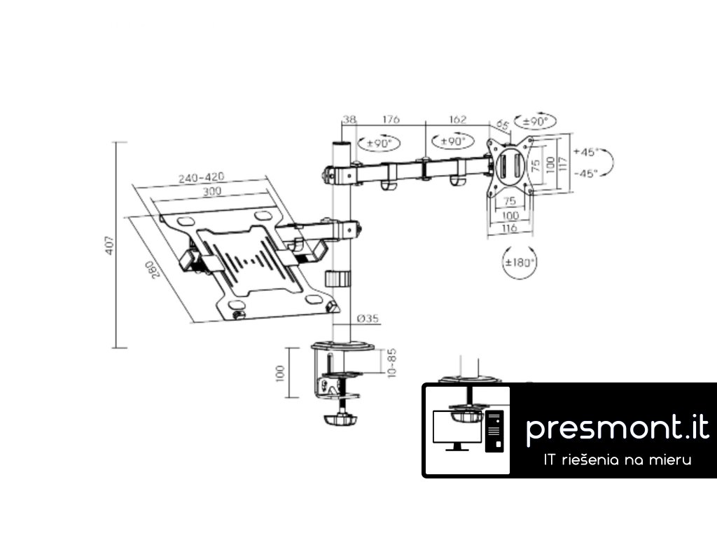 Držák monitoru Brateck LDT66-C024ML je inovativní stolní držák, který byl navržen s ohledem na vaše potřeby a zlepšení pracovního prostoru. Tento všestranný stolní držák je ideální pro použití s různými typy monitorů, ať už pracujete z domova, v kanceláři nebo ve vzdělávacím prostředí. S držákem monitoru Brateck se vaše pracoviště stane efektivnějším a pohodlnějším. Díky odolné ocelové konstrukci poskytuje stabilní podporu pro monitor s úhlopříčkou 17'' až 32'' o hmotností až 9 kg a notebook o hmotnosti až 4 kg. Flexibilní konstrukce pro dostatečné nastavení výšky a pozorovacích úhlů s možností nastavení orientace monitoru na výšku nebo na šířku. Součástí balení jsou průchodky a svorky pro instalaci na téměř jakoukoliv pracovní plochu. Odnímatelná deska VESA pro uživatelsky přívětivou instalaci. Součástí balení jsou kabelové spony pro usnadnění organizace vedení kabelů. Hlavní vlastnosti: • Flexibilní nastavení polohy: Držák umožňuje snadné nastavení výšky, nastavitelný náklon monitoru v úhlu +/- 45°, otočení monitoru o 360°, nastavení úhlů ramene o 270° (3 závěsy po 90°) takže můžete snadno najít optimální pozici pro pohodlné a ergonomické používání. Odnímatelná deska VESA umožňuje snadnou instalaci monitoru. • Univerzální kompatibilita: Tento stolní držák je kompatibilní s většinou monitorů o velikosti od 17'' do 32'' palců a s VESA standardy 75x75mm a 100x100mm. Nezáleží na tom, zda používáte LCD, LED nebo OLED monitor, držák monitoru Brateck poskytne bezpečné a stabilní uchycení. • Odolná konstrukce: Držák je vyroben z vysoce kvalitního materiálu, který zajišťuje stabilitu a odolnost. • Snadná instalace: Držák je dodávám s kompletním montážním příslušenstvím, díky němuž je možné ho snadno namontovat na stůl během několika minut. Snadná montáž pomocí svorky na desky o tloušťce 10-85 mm nebo pomocí průchodky na desky o tloušťce 10-40 mm. Přednosti: • Zlepšuje ergonomii a pohodlí při práci s monitorem • Ušetří místo na vašem stole a pomůže udržovat věci organizované • Kompatibilní s širokou škálou monitorů a velikostí • Robustní a stabilní konstrukce pro dlouhodobé používání Užijte si optimální pracovní prostředí a zvyšte svoji produktivitu používáním držáků monitorů Brateck. Díky nastavitelnosti a univerzální kompatibilitě vám tento produkt nabídne skvělý zážitek při práci na vašem počítači. Parametry: • Systém změny výšky monitoru: posun na tyči • Způsob montáže: svorka, průchodka • Maximální výška: 40,7 cm • Dosah: 37,6 cm • Určeno pro zařízení: monitor a notebook • Ramena - počet monitorů: 2 • Maximální náklon (nahoru, dolů): 45°/45° • Maximální vychýlení (vpravo, vlevo): 180° • Maximální otáčení obrazovky: 360° • Maximální hmotnost monitoru: 9 kg • Maximální rozměry monitoru: 32' • USB připojení: ne • Barva: černá mat • Rozměry (Š x V x H): 869mm x 112mm x 561mm • Hmotnost: 4.8 kgDodatočné parametre