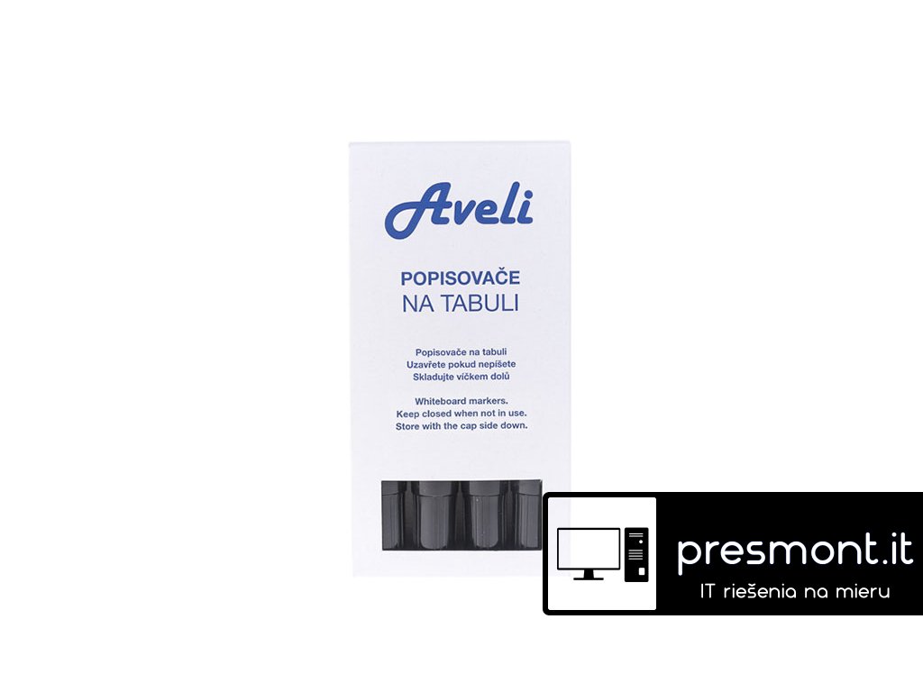 Popisovač pro tabule a flipcharty AVELI. Sada 4 černých popisovačů. - Netoxický - Šíře stopy 3 mm - Kuželový hrot - Snadno stíratelný - Odolný proti vyschnutíDodatočné parametre