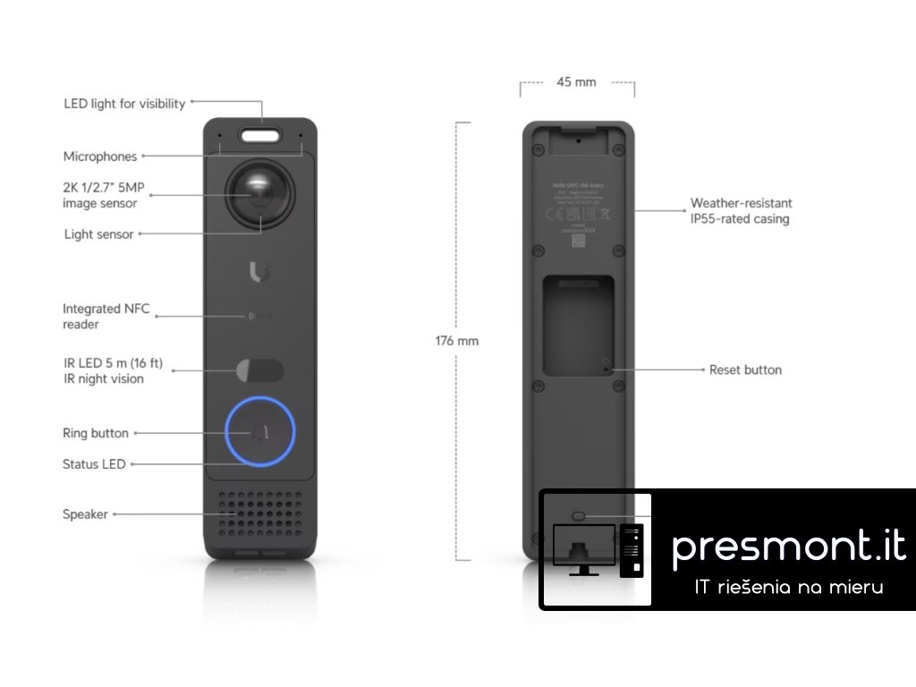Ubiquiti UVC-G6-Entry Inteligentní vstupní systém s podporou UniFi Protect a UniFi Access Přehled *Rozměry: 176 × 45 × 29,6 mm *IR noční vidění: dosah až 5 m *Rozpoznávání obličejů: ano *Chytré detekce: osoby, vozidla, zvířata *Rozlišení: hlavní kamera 5 MP, balíková kamera 8 MP *Zorné pole hlavní kamery: H 100°, V 135°, D 180° *Zorné pole balíkové kamery: H 66°, V 51,7°, D 78° *Audio: obousměrná komunikace *Krytí: IP55 *Tamper resistance: IK07 *Montáž: na zeď, na instalační krabici, 20° klínový držák (součást balení), instalační krabice volitelně *Přístup NFC kartou / přívěskem: ano *Apple / Google Wallet: ano *Odemknutí mobilem: ano *Interkom a zvonek: ano *UniFi aplikace: Protect, Access Výkon *Síťové rozhraní: Gigabit Ethernet (RJ45) *Konektivita: BLE 4.1, NFC *Nastavení obrazu: barva, jas, ostrost, kontrast, vyvážení bílé, expozice, 2DNR, 3DNR, redukce šumu pohybem, maskování, textový overlay, HDR *Max. snímková frekvence: hlavní kamera: 30 FPS, package kamera: 3 FPS *Rozlišení videa:hlavní kamera: 5 MP, 1920 × 2560 (3:4) | package kamera: 8 MP, 3264 × 2448 (4:3) Optika *Senzor: hlavní kamera: 5 MP CMOS, package kamera: 8 MP CMOS *Objektiv: pevná ohnisková vzdálenost *Noční režim: integrované IR LED osvětlení a IR cut filtr Hardware *Max. spotřeba: 16 W *Rozsah napájení: 42–57 V DC *Napájení: PoE+ *Procesor: čtyřjádrový čip Arm® Cortex®-A53 *Hmotnost: 275 g *Materiál těla: hliník *Tlačítka: zvonkové tlačítko, reset, sabotážní spínač *LED: RGBW Provozní podmínky *Provozní teplota: -30 až 50 °C *Provozní vlhkost: 5–90 % (nekondenzující) Certifikace *CE, FCC, IC NDAA Compliant: Ano Web výrobce: https://techspecs.ui.com/unifi/door-access/uvc-g6-entryDodatočné parametre