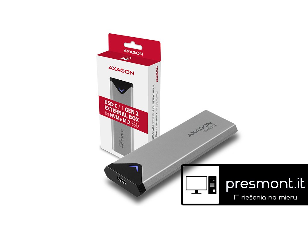 Super rychlý externí box AXAGON EEM2-UG2 s USB 3.2 Gen 2 rozhraním je určen pro NVMe (PCI-Express) M.2 SSD disky. Nejnovější USB rozhraní dovolí užívat si rychlost moderních M.2 SSD disků. Díky rychlému USB 3.2 Gen 2 rozhraní je přenosová rychlost až 10Gb/s. Pohodlné připojení umožňuje oboustranný USB-C konektor. Externí M.2 box podporuje i další moderní funkce např. TRIM. Do externího boxu je možné použít NVMe M.2 SSD disky až do rozměru 22x80 mm. Box nemá omezení kapacity SSD disků. Karty M.2 mohou být jednostranné nebo oboustranné. Hliníkové tělo boxu a teplovodivé podložky zajistí velice dobré chlazení vloženého M.2 SSD disku. Vložením M.2 SSD disku do tohoto boxu snadno vytvoříte rychlý a kompaktní externí disk. Box je možné použít jak s počítači a notebooky, tak s mobilními telefony a tablety s podporou funkce OTG. Vstup: • USB 3.2 Gen 2 / SuperSpeed+ USB s rychlostí až 10 Gbit/s. • Připojení přes reverzibilní USB type C female konektor. Podpora zařízení: • NVMe M.2 SSD disky, • určeno pro karty formátu M-key nebo B+M key, • NGFF 75-pinový M-key slot pro NVMe M.2 disky. Další vlastnosti: • Kompatibilní s USB 3.2 Gen 2, zpětně kompatibilní s USB 3.1 Gen 1 / USB 3.0 a USB 2.0. • Podpora přenosových rychlostí 10.000 / 5000 / 480 Mbit/s (SuperSpeed 10 Gbps / SuperSpeed / HighSpeed). • Podpora M key nebo B+M key NVMe (PCI-Express) M.2 SSD disků bez omezení maximální kapacity. • Podpora M.2 disků rozměrů - 2242, 2260, 2280 mm. • Podpora jednostranných i oboustranných M.2 SSD disků. • Vyhovuje PCI Express Base Specification Revision 3.1a specifikaci. • Vyhovuje NVM Express 1.3 specifikaci. • Vyhovuje USB Mass Storage Class specifikaci. • Celková propustnost / přenosová rychlost boxu je dána použitým USB 3.2 Gen 2 rozhraním (teoreticky až 10 Gbit/s). • Reálná propustnost / přenosová rychlost boxu kolem 1000 MB/s (1 GB/s) je dána limity USB 3.2 Gen 2 rozhraním. • Podpora UASP (USB Attached SCSI) pro rychlejší přenos dat ve Windows 8 a novějších. • Podpora funkce TRIM pro omezení pozvolné degradace výkonu SSD v čase. • Podpora bootování z SSD v externím boxu. • Možnost připojení zařízení za chodu díky podpoře Hot Plug. • Plná podpora Plug and Play. • Podpora úsporného režimu - usínání disku po 5 minutách nečinnosti. • Napájení po USB sběrnici až 900mA z jednoho USB portu zcela dostačuje ve všech případech. • Decentní modrá LED dioda indikující připojení k USB portu počítače (trvalým svitem) a přenos dat (blikáním). • Hliníkové odolné tělo a teplovodivé podložky napomáhají lepšímu chlazení M.2 SSD disku. • Vyšší povrchová teplota boxu není závadou - díky hliníkovému tělu je teplo generované provozem disku lépe odváděno a předáváno do okolí. • Připojení přes USB 3.2 Gen 2 type C female konektor. • Kabel USB type C male / USB type C male délky 22 cm je součástí balení. Další údaje: • Rozměry externího boxu 115 x 39 x 11 mm. • Hmotnost externího boxu 43 g (bez USB kabelu a M.2 SSD disku). Podporované operační systémy: • MS Windows 7 / 8 / 8.1 / 10 a novější, Windows Server 2008 / 2012 / 2016 a novější (podporovány všechny 32- i 64-bitové verze OS Windows), Mac OS X 10.x a vyšší, Linux s jádrem 2.6.x a vyšším, Android (nutná podpora ze strany OS a zařízení). • Pozn.: Při použití s Windows 7 je nutné ověřit u výrobce M.2 SSD disku podporu tohoto OS a dostupnost ovladače. Balení v kartónové krabičce s přehledně uvedenými parametry obsahuje: • USB-C 3.2 Gen 2 externí box pro NVMe M.2 SSD, • USB type C – type C kabel délky 22 cm, • 3ks teplovodivých podložek, • montážní materiál a šroubovák, • tištěný instalační návod EN/CZ/DE/ESP/FR/HU/IT/PL/RO/RU/SK/BG.Dodatočné parametre