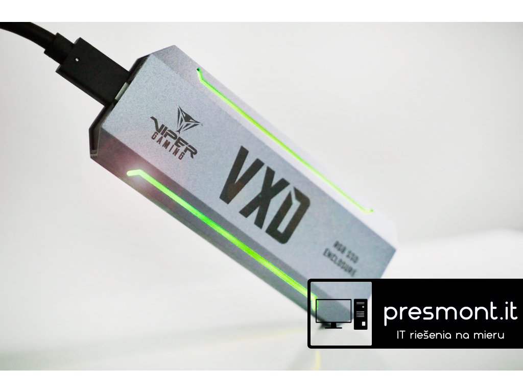 Patriot VXD M.2 externí box pro M.2 SSD * poskytuje vysoké přenosové rychlosti USB 3.2 Gen2 rozhraní (rychlost až 1000 MB/s) a univerzálnost USB typ-C rozhraní * funguje jako pasivní chladič a nabízí stylový hliníkový design, doplněný o RGB osvětlení * sníží teplotu disku až o 40% Kompatibilní s M.2 PCIe 3.0 x4 NVMe disky (M.2 2230/42/60/80). Podporuje kapacity disků v rozmezí 120 GB až 4 TB. Recenze: Patriot Viper VXD M.2 SSD Enclosure Review | ThinkComputers.orgDodatočné parametre