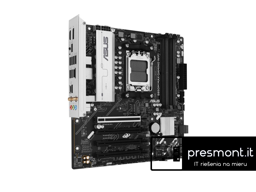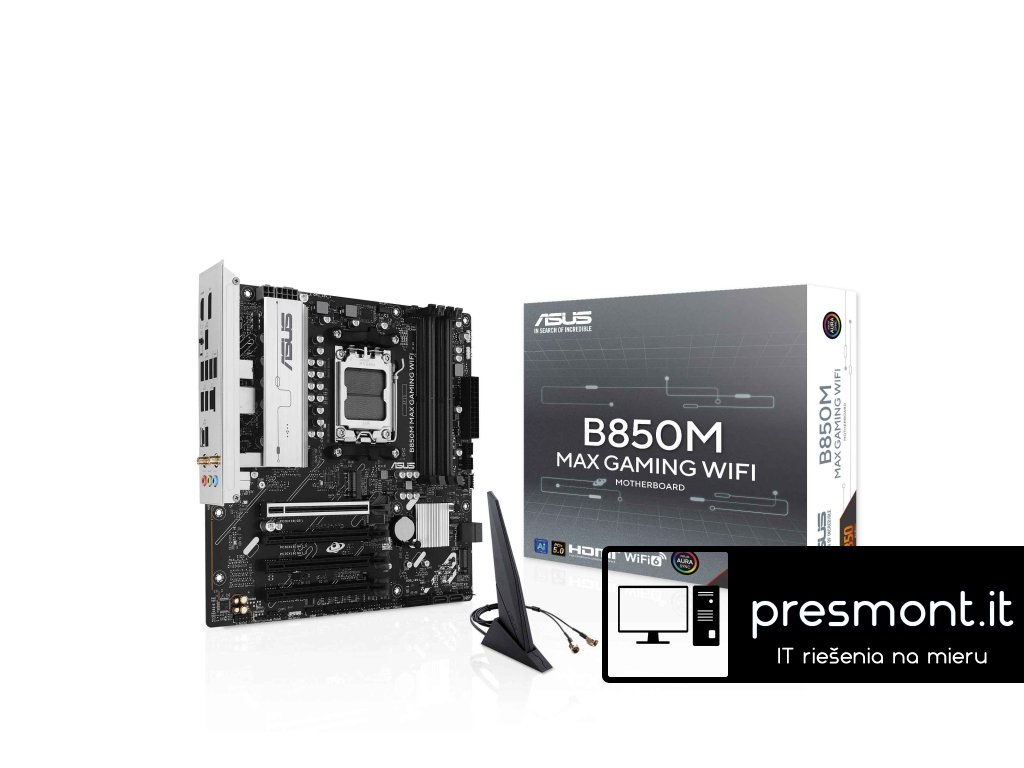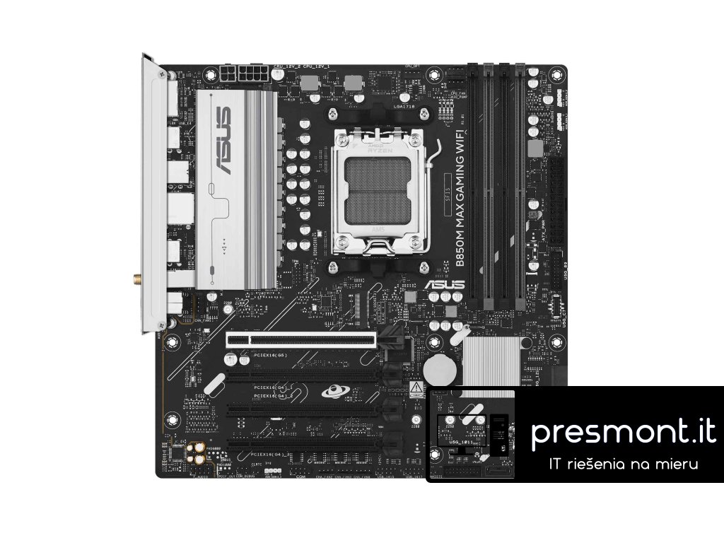 ASUS B850M MAX GAMING WIFI Form Factor: mATX Form Factor (24.4 cm x 24.4 cm) CPU: AMD Socket AM5 pro desktopové procesory AMD Ryzen 9000, 8000 a 7000 Series Chipset: AMD B850 Chipset Paměť:4 x DIMM sloty, max. 256GB, DDR5 Podpora až 8000+MT/s (OC) s procesory Ryzen 9000, 8000 a 7000 Series, ECC a Non-ECC nebufferované DIMM Dvoukanálová paměťová architektura Podpora AMD Extended Profiles for Overclocking (EXPO™) ASUS Enhanced Memory Profile (AEMP) Grafické výstupy: 1 x DisplayPort 1 x HDMI™ port Rozšiřující sloty: AMD Ryzen™ 9000 & 7000 Series desktopové procesory 1 x PCIe 5.0 x16 slot (supports x16 mode) 3 x PCIe 4.0 x16 slot (support x1 mode) AMD Ryzen™ 8000 Series desktopové procesory 1 x PCIe 4.0 x16 slot (supports x8/x4 mode) 3 x PCIe 4.0 x16 slot (support x1 mode) Úložiště: Podpora 3 x M.2 slotů a 4 x SATA 6Gb/s portů AMD Ryzen™ 9000 & 7000 Series desktopové procesory M.2_1 slot (Key M), type 2280 (supports PCIe 5.0 x4 mode) AMD Ryzen™ 8000 Series desktopové procesory M.2_1 slot (Key M), type 2280 (supports PCIe 4.0 x4 mode) Ethernet: 1 x Realtek 1Gb Ethernet ASUS LANGuard Wireless and Bluetooth: Wi-Fi 6, 1x1 Wi-Fi 6 (802.11ax), Podpora frekvenčních pásem 2.4 / 5GHz Bluetooth® v5.4 USB: Zadní USB (Celkem 9 portů) 2 x USB 10Gbps porty (1x Type-A + 1 x USB Type-C) 2 x USB 5Gbps porty (2x Type-A) 5 x USB 2.0 porty (5x Type-A) USB header (Celkem 9 portů) 1 x USB 5Gbps konektor (podpora USB Type-C®) 1 x USB 5Gbps header – podporuje 4 další USB 5Gbps porty 2 x USB 2.0 headery – podporují 4 dalších USB 2.0 portů Audio: Realtek 7.1kanálový HD audio kodek s vysokým rozlišením Zadní panel I/O porty: 2 x USB 10Gbps port (1x Type-A + 1 x USB Type-C) 2 x USB 5Gbps ports (2 x Type-A) 5 x USB 2.0 ports (5 x Type-A) 1 x DisplayPort 1 x HDMI port 1 x Wi-Fi module 1 x Realtek 1Gb Ethernet port 3 x Audio jacks 1 x BIOS FlashBack button Interní I/O porty: Chlazení a ventilátory 1 x 4-pin CPU Fan header 1 x 4-pin CPU OPT Fan header 1 x 4-pin AIO Pump header 4 x 4-pin Chassis Fan headers Napájení 1 x 24-pin Main Power connector 1 x 8-pin +12V CPU Power connectors 1 x 4-pin +12V CPU Power connectors Úložiště 3 x M.2 slots (Key M) 4 x SATA 6Gb/s ports USB 1 x USB 5Gbps konektor (podpora USB Type-C®) 1 x USB 5Gbps header – podporuje 4 další USB 5Gbps porty 2 x USB 2.0 headery – podporují 4 dalších USB 2.0 portů Ostatní 3 x Gen 2 adresovatelné RGB konektory 1 x konektor pro vymazání CMOS (Clear CMOS) 1 x konektor pro detekci otevření skříně (Chassis Intrusion) 1 x konektor sériového portu (COM Port) 1 x konektor pro přední panel audio (F_AUDIO) 1 x konektor pro digitální audio výstup S/PDIF 1 x SPI TPM konektor (14-1 pin) 1 x 10-1 pinový konektor pro systém předního panelu BIOS:256 Mb Flash ROM, UEFI AMI BIOSDodatočné parametre