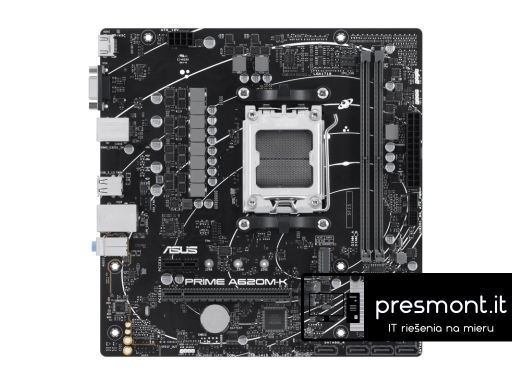 ASUS PRIME A620M-K * Aura Sync RGB Lighting * AI Noise Cancelation Chipset: AMD A620 Rozměrový formát: micro-ATX (226x221mm) Podpora pro procesory: AMD Ryzen™ řady 7000 Patice procesoru: AM5 Paměť: * 2x DIMM, max. 96GB, DDR5 6400+(OC)/6200(OC)/6000(OC)/5800(OC)/5600(OC)/5400(OC)/5200/5000/4800, bez ECC, bez vyrovnávací paměti * dvoukanálová architektura paměti * podporuje AMD EXtended Profiles for Overclocking (AMDEXPO™) Grafické výstupy: * 1x VGA * 1x HDMI® 2.1 Zvuková karta: Realtek 7.1 Surround Sound High Definition Audio CODEC, podporuje přehrávání až 24-bit/192kHz Ethernet: 1x Realtek 1Gb Ethernet WLAN + Bluetooth: ne Rozšiřující sloty: * 1x PCIe 4.0 x16 (podporuje x16 režim) * 1x PCIe 3.0 x1 RAID řadič: technologie PCI2 RAIID podporuje PCIe RAID 0/1/10 a SATA RAID 0/1/10 Úložný prostor: celkem podporuje 1 slot M.2 a 4 porty SATA 6Gb/s * 1x M.2_1 (Key M), typ 2242/2260/2280 (podporuje režim PCIe 4.0 x4) * 4x SATA 6Gb/s USB: Zadní USB (celkem 6 portů) * 4x USB 3.2 Gen 1 (4x typ-A) * 2x USB 2.0 (4x typ-A) Přední USB (celkem 6 portů) * 1x USB 3.2 Gen 1 (5G) header - podporuje další 2 porty USB 3.2 Gen 1 * 2x USB 2.0 header - podporují další 4 porty USB 2.0 Porty na zadním panelu: * 4x USB 3.2 Gen 1 (4x typ-A) * 2x USB 2.0 (4x typ-A) * 1x VGA * 1x HDMI™ * 1x Realtek 1Gb Ethernet * 3x audio konektor * 1x PS/2 kombinovaný port klávesnice/myši Interní porty: Související s ventilátorem a chlazením * 1x 4-pin CPU Fan header * 1x 4-pin Chassis Fan header Napájení * 1x 24-pin hlavní napájecí konektor * 1x 8-pin +12V napájecí konektor Související s úložištěm * 1x M.2 slot (Key M) * 4x SATA 6Gb/s port USB * 1x USB 3.2 Gen 1 (5G) header - podporuje další 2 porty USB 3.2 Gen 1 * 2x USB 2.0 header - podporují další 4 porty USB 2.0 Ostatní * 2x adresovatelný Gen 2 header * 1x Aura RGB header * 1x Clear CMOS header * 1x COM Port header * 1x Front Panel Audio header (AAFP) * 1x S/PDIF Out header * 1x header reproduktoru * 1x SPI TPM header (14-1pin) * 1x 10-1 pin System Panel header BIOS: 256Mb Flash ROM, UEFI AMI BIOS Příslušenství: * 2x SATA 6Gb/s kabel * 1x I/O záslepka * 1x balení šroubů pro M.2 SSD * 1x uživatelská příručkaDodatočné parametre